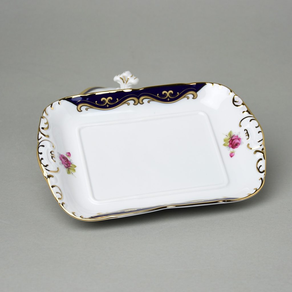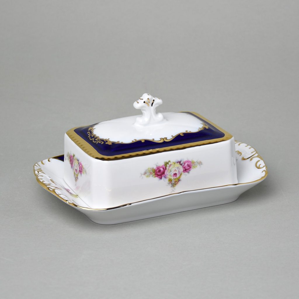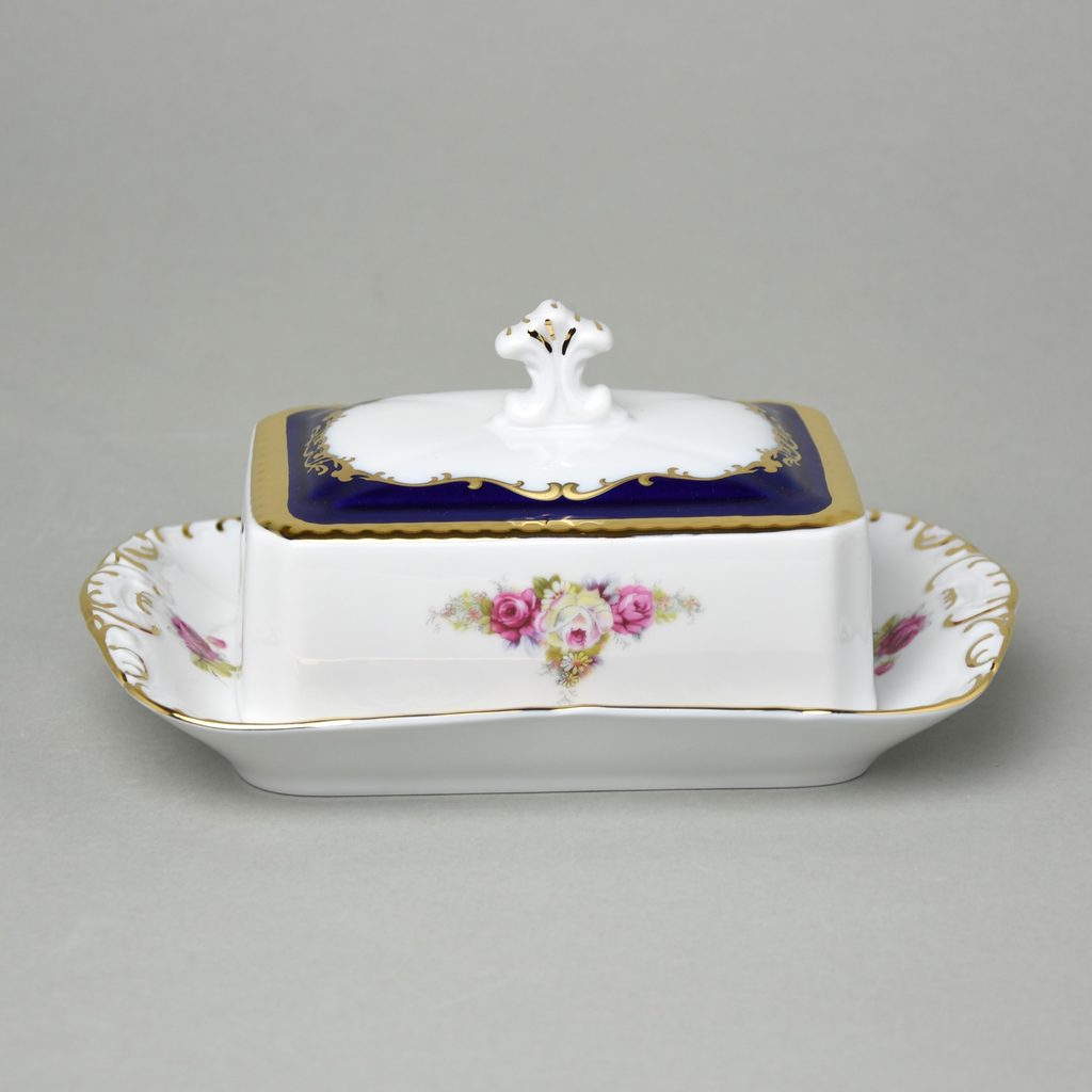 butter dish for classic 250 g butter in the shape of Sonata with rich decor cobalt blue + gold + roses from the Leander Loučky porcelain factory