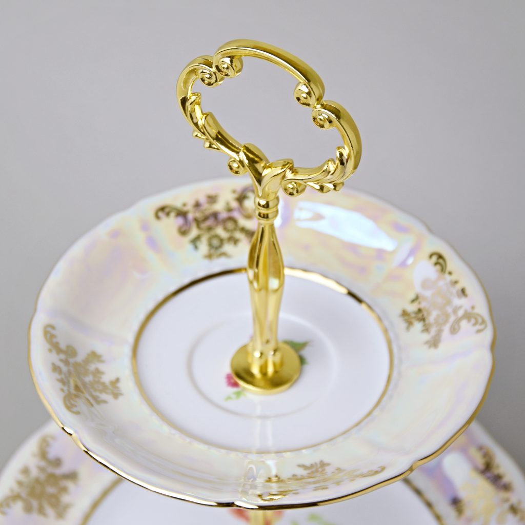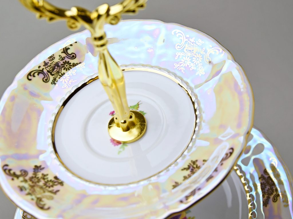 Rich popular decor with gold, pearl look + flowers on a classic 3-piece compartment dish (25 cm plate, 19 cm plate, 15 cm saucer), high-quality metal stick with handle, h. 34 cm