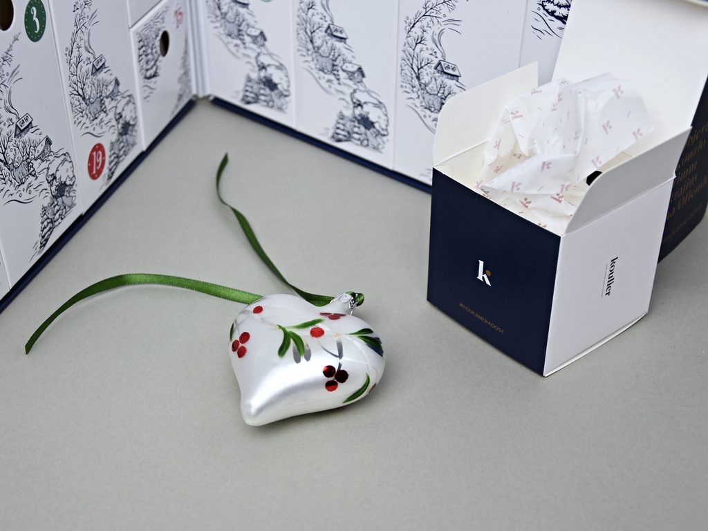 Beautiful ADVENT CALENDAR with Christmas tree decorations - a set of 24 pcs. of various shapes from the Holly collection from the Czech glasswork KOULIER. The beautiful holly Christmas decor is seriously magical and fresh in the traditional Christmas colors of red, green, white.