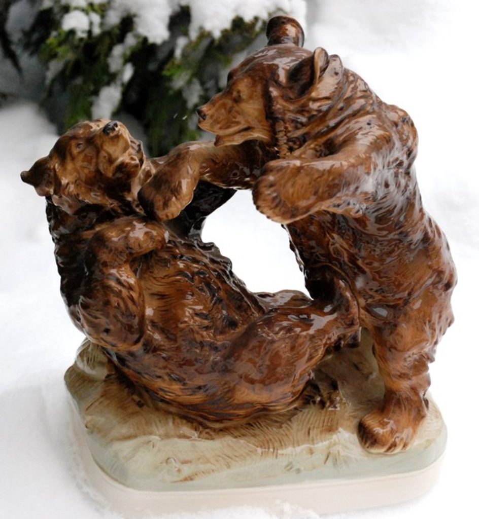Porcelain figure of a couple of bears fighting. Made in the traditional Czech manufactory Duchcov (Royal Dux Bohemia). Perfect gift for all bear lovers.