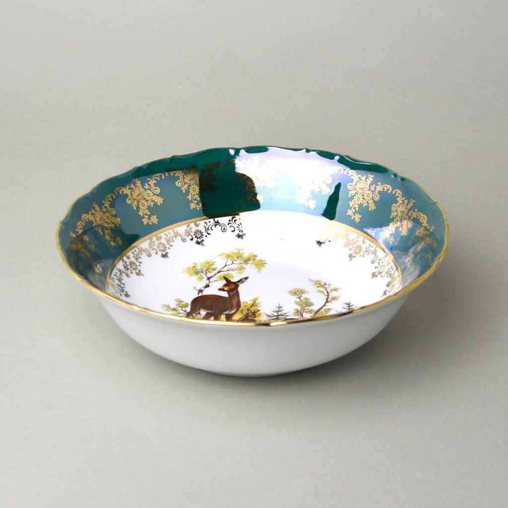 Bowl 23 cm Ophelia shape richly decorated with a hunting green motif with gold in the Royal Czech workshop near Karlovy Vary. Each time a different random game decor (pheasants, hare, doe, deer, fox, grouse), gold decoration.