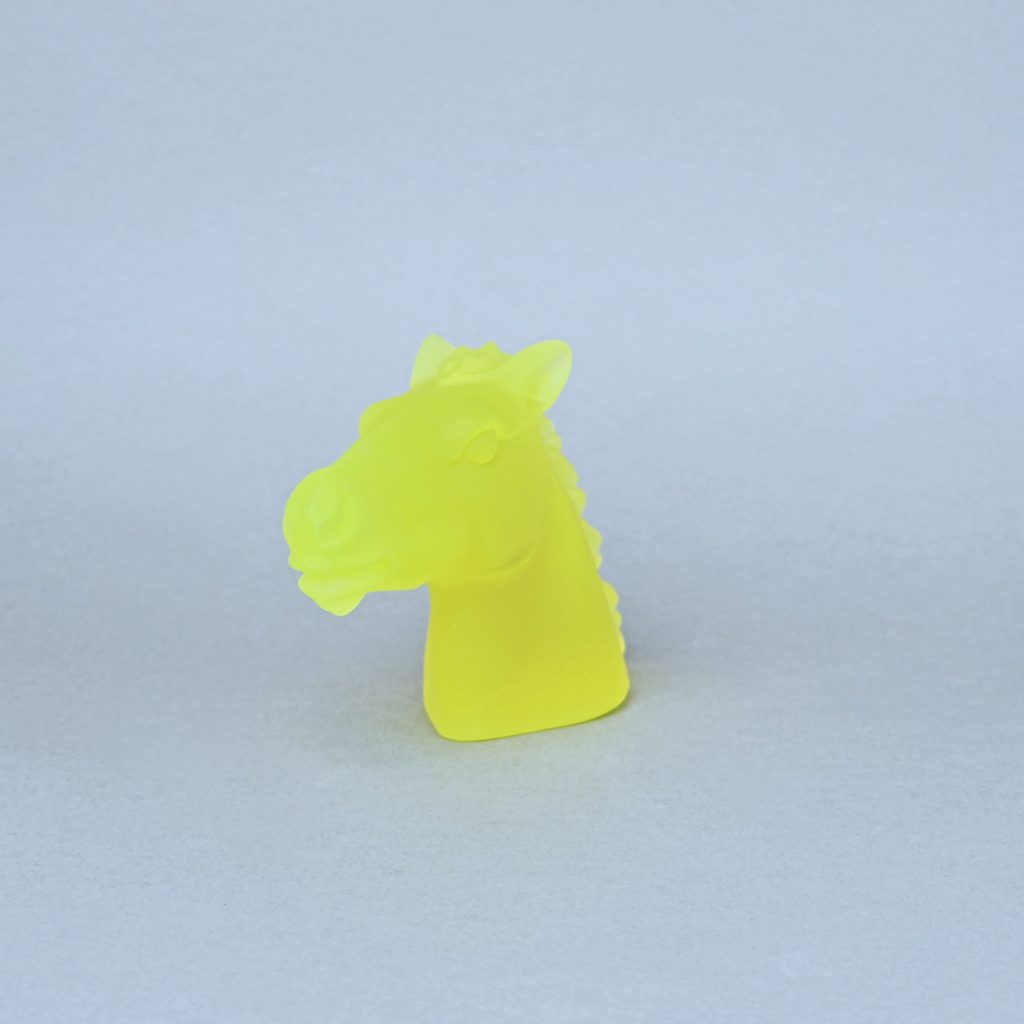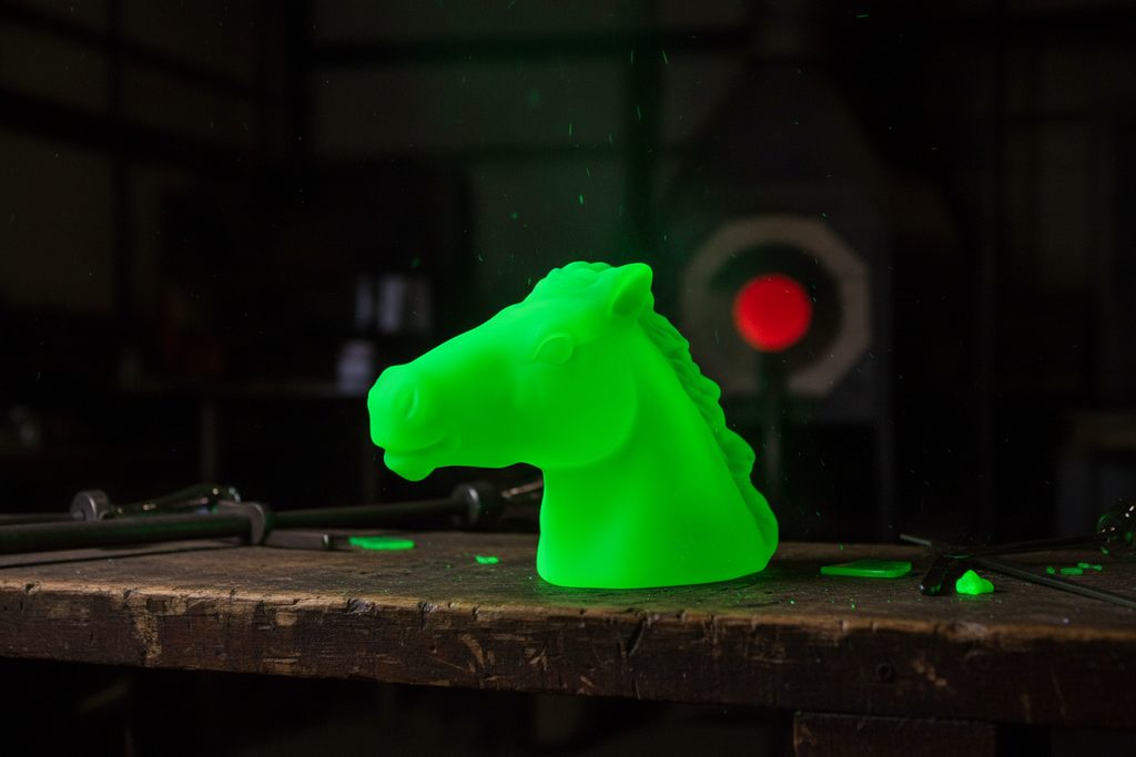 Decorative glass Bust of a horse made of genuine uranium glass, handmade in the Janov Glassworks.