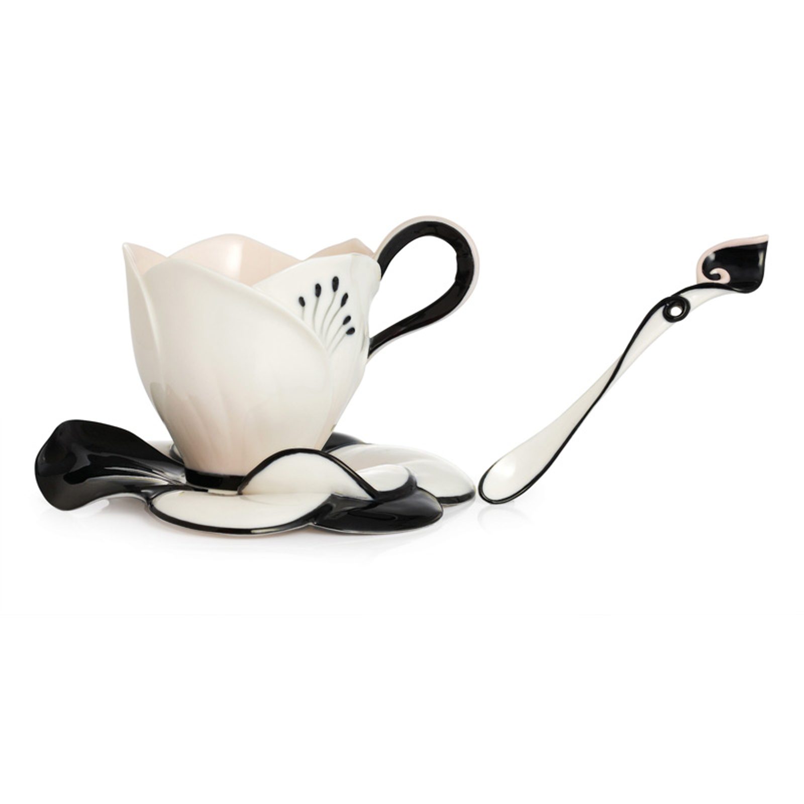 Camellia design sculptured porcelain cup and saucer, FRANZ Porcelain + spoon