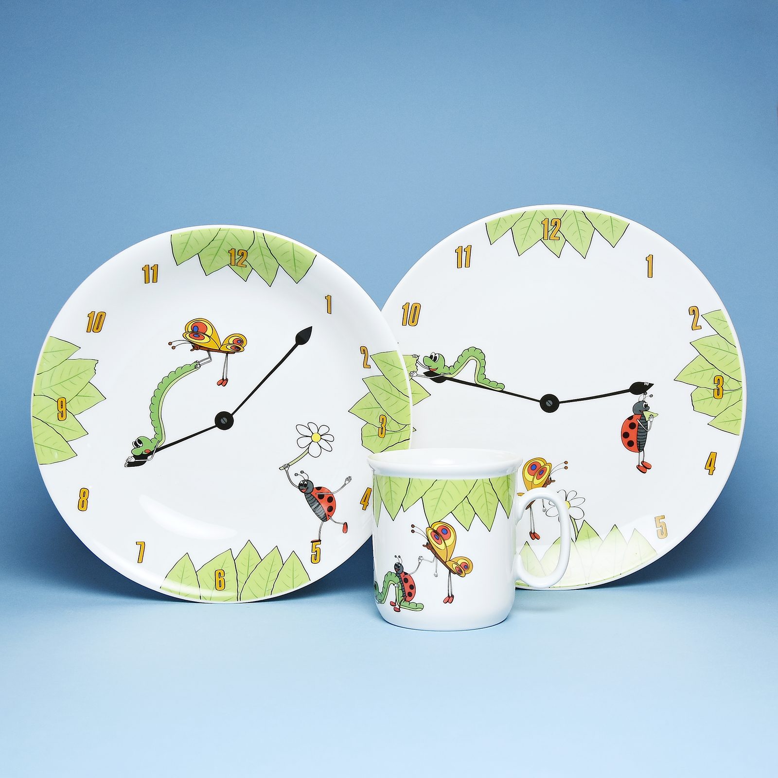 Children's set Clock, 3 pcs., Thun 1794 Carlsbad porcelain Plate 21 cm plus bowl 20 cm plus mug 0,2 l, packed in nice Gift box.