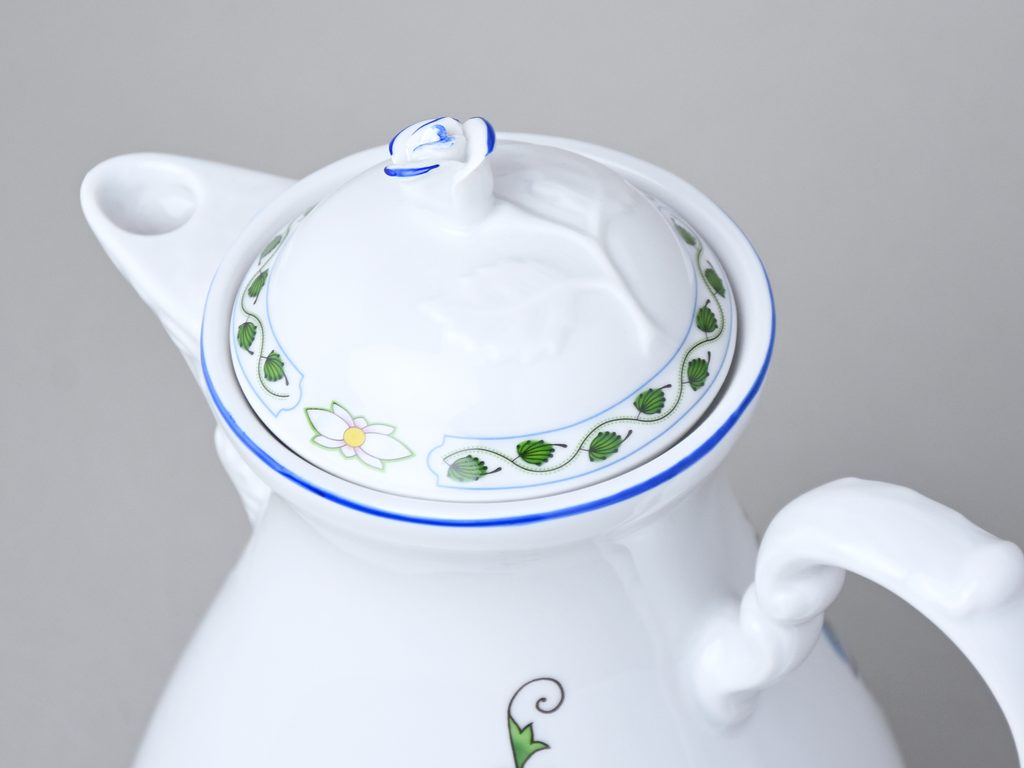 It was already in 1864 when the industrialist from Dubí Anton Tschinkel bought a large building called Lower Forest Mill in present Tovární street in Dubí near Teplice and rebuilt it into a Majolica manufacture. In 1885, the firm O. C. Teuchert from the near Meissen purchased the factory from him and started there production of porcelain in Rococo style with so called “onion” pattern. Its production achieved an extraordinary success and interest of customers which can be seen from the number of parts of the set; in 1929, when the factory was owned by Artur Bloch, it included 257 shapes and until 1956, it was marked with designation MEISSEN in an oval frame.