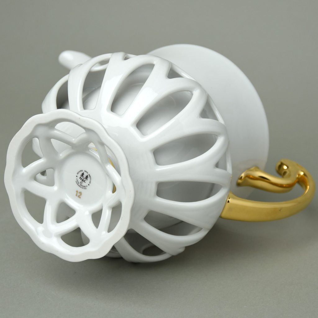 The absolute pinnacle of porcelain creation from Chodov, Byzant shape, perforated porcelain. White decor with gold. The watering can is new, but made in 2013, so the gold (color) on the handle is slightly oxidized in one place. Natural process.