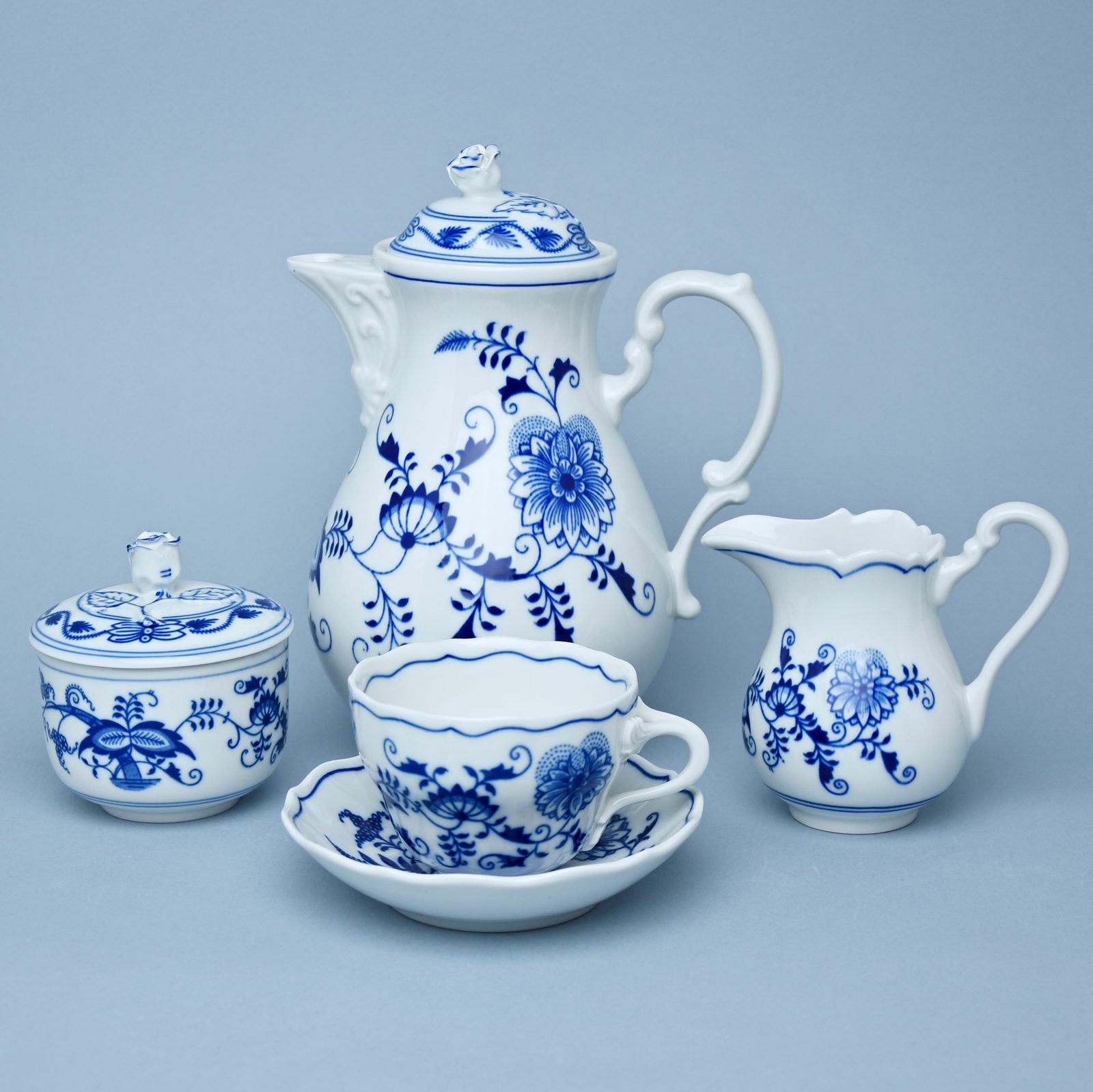 Coffee set for 6 pers., Original Blue Onion Pattern Coffee pot 1,55 l, Creamer, Sugar bowl, 6x Cup plus Saucer 0,2 l