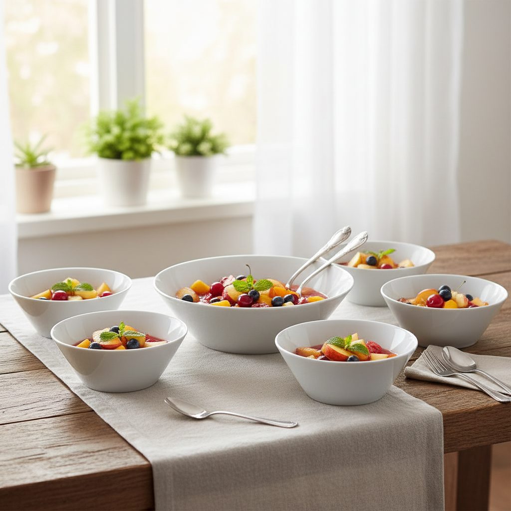 Compot set for 6 persons, Thun 1794 Carlsbad porcelain, TOM white Bowl 24 cm, 6x bowl 16 cm Shape TOM, white porcelain, no decoration. MICROWAVE AND DISHWASHER SAFE, INGLAZED.