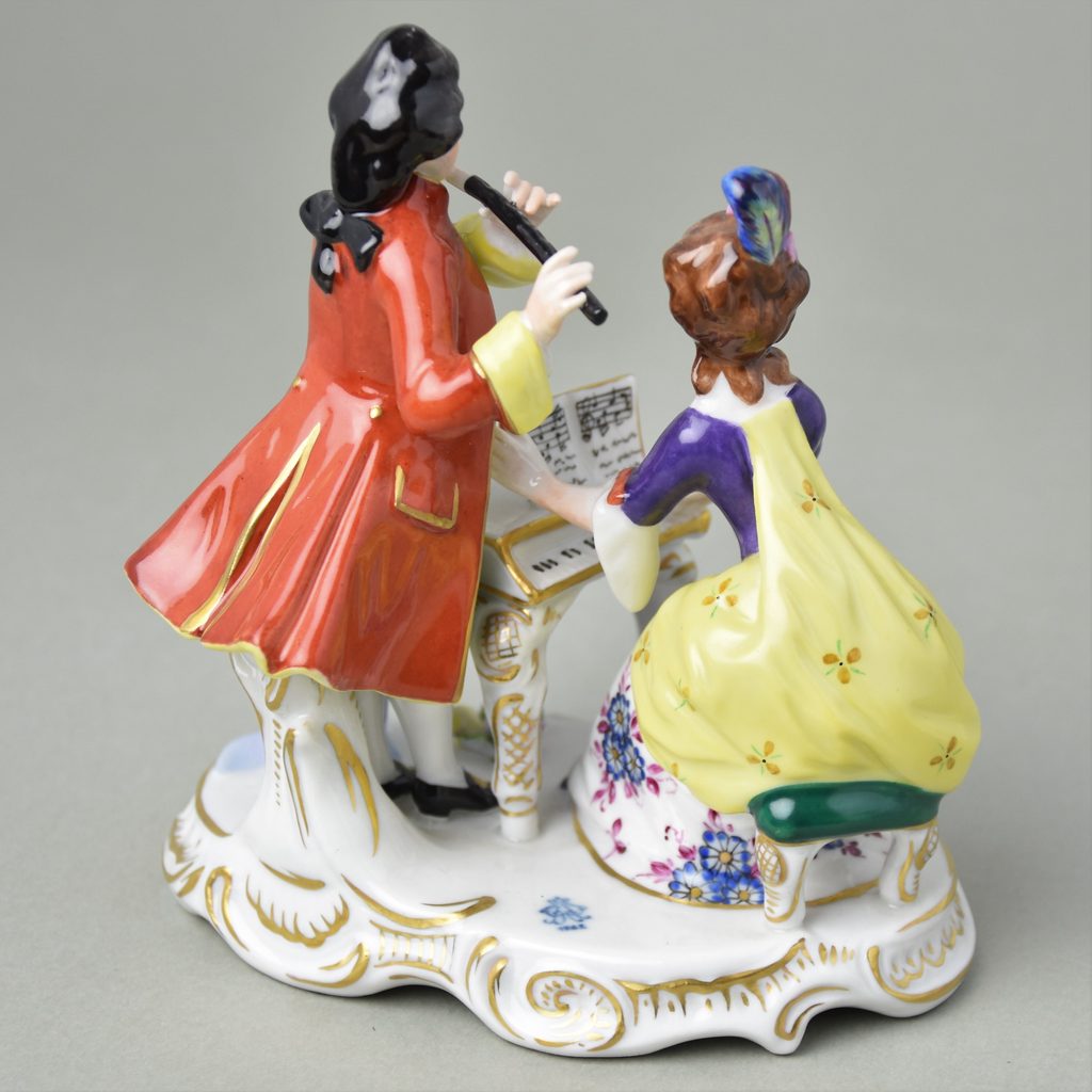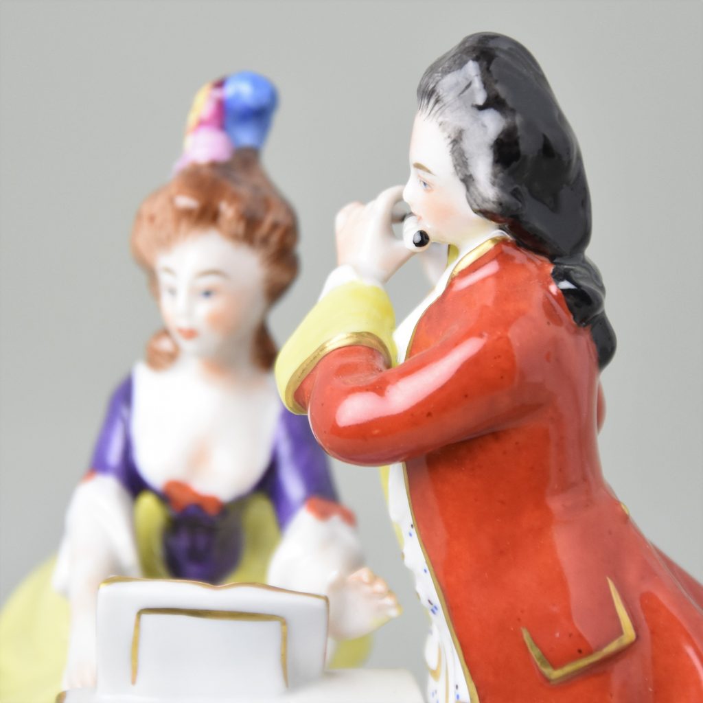 The porcelain figure of the sitting woman playing the piano with a man playing the flute from the famous German manufactures Gläserne Porzellanmanufaktur. Golden details.