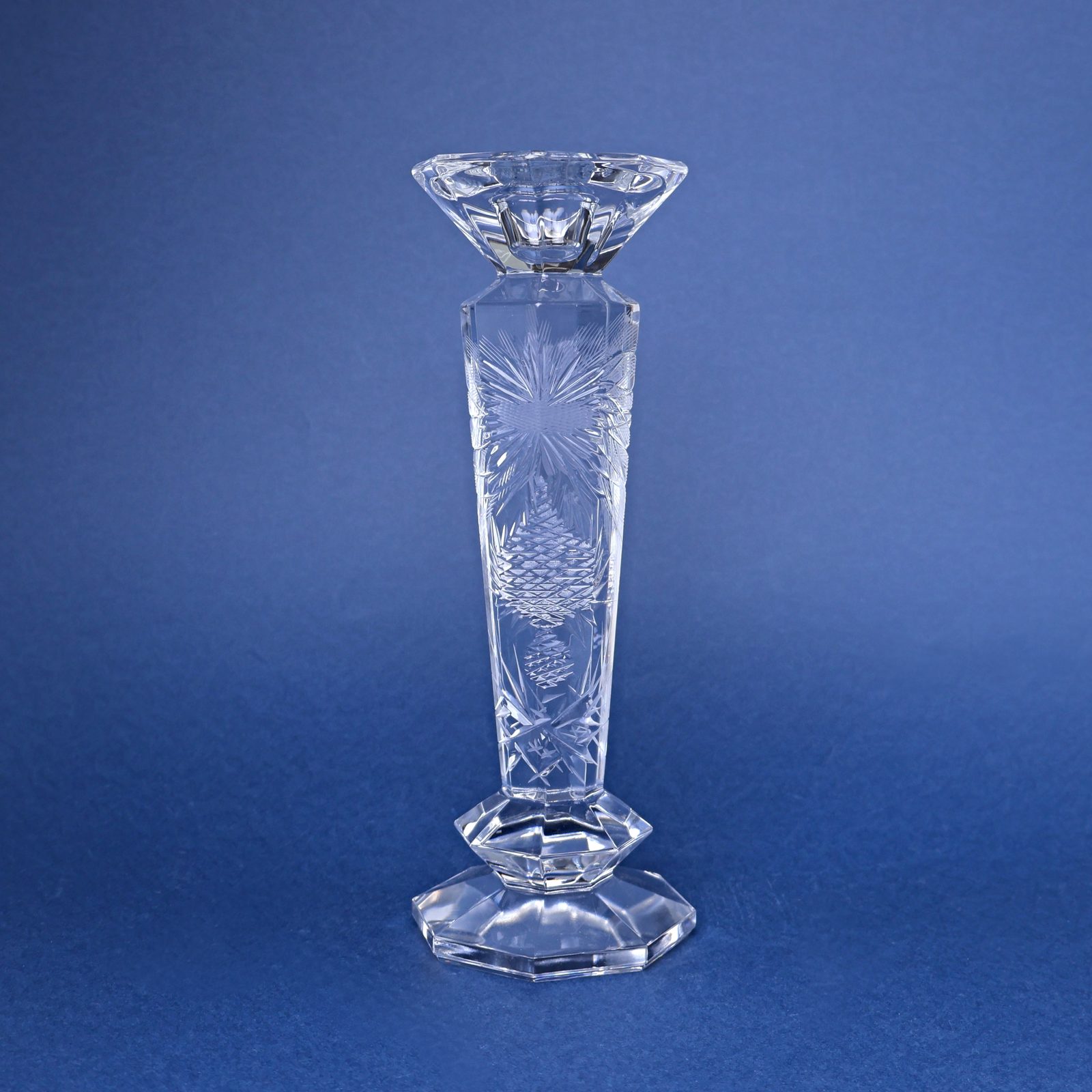 Hand cut crystal candlestick made from Czech 24% PbO crystal by the Crystal Bohemia glass factory in Poděbrady. Beautiful hand cuting in the natural motif of thistles. A wonderful gift.