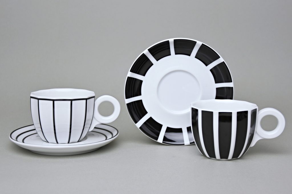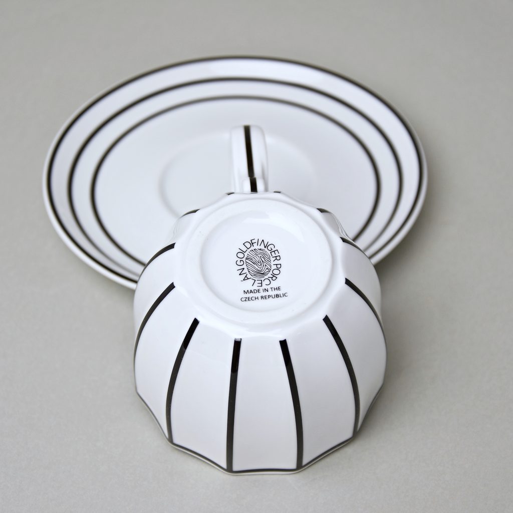 Tea / Coffee cup and saucer "Šárka" has an original design based on the tradition of Czech cubism in art deco style. Decor white + black lines. Made in the Czech porcelain manufactory Goldfinger porcelain, which produces original, author's small series porcelain products. Their strengths are in creative design and high quality of the products.