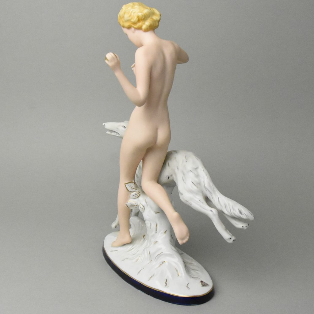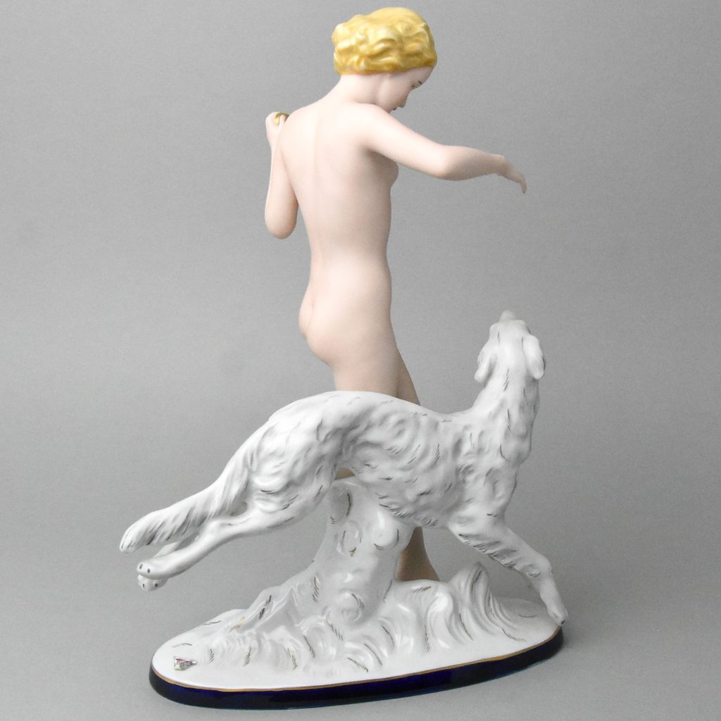 Beautiful larger figurine of the goddess of the hunt Diana with a hunting dog. Figurine from the Duchcov porcelain factory Royal Dux.