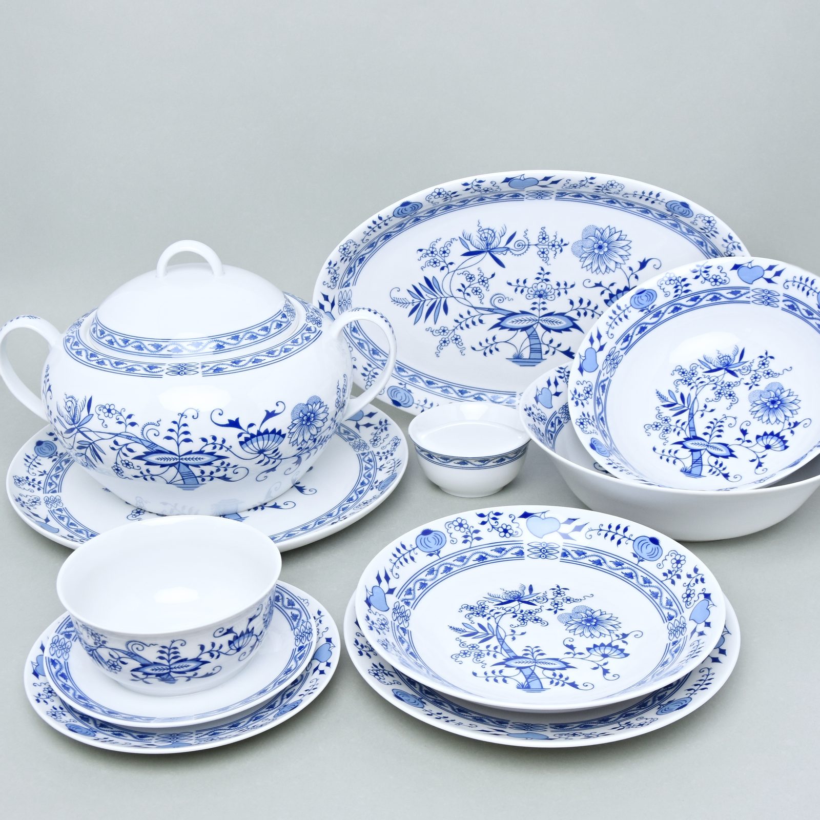 Dining set for 6 persons, Henrietta, Thun 1794 Carlsbad porcelain Blue Onion Pattern on Carlsbad porcelain named Henrietta: 6x plate flat 24 cm, 6x plate deep 22 cm, 6x plate dessert 19 cm, soup bowl 3 l, bowl oval 36 cm, dish round flat 30 cm, bowl deep 23 cm, bowl deep 25 cm, sauce bowl with underbowl 0,5 l, salt and pepper bowl Blue Onion Pattern Henrietta. MICROWAVE AND DISHWASHER SAFE, INGLAZED.