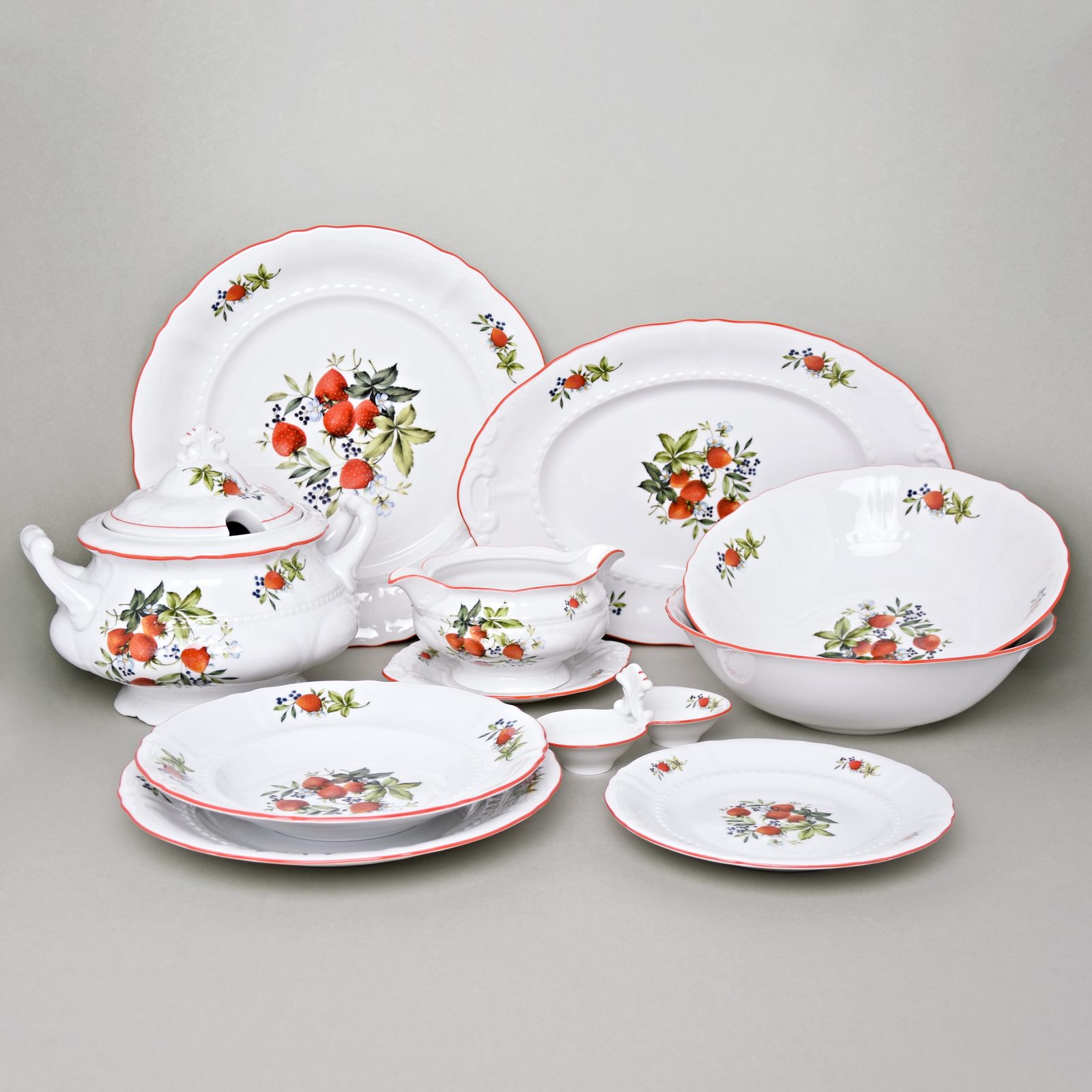 Dining set for 6 persons, Sonata, strawberries, Leander 1907 1 soup tureen 2,50 l, 6 plate flat 25 cm, 6 plate deep 23 cm, 6 plate dessert 19 cm, 1 sauce boat 0,35 l, 1 salt shaker with stand 6 cm, 1 platter round 32 cm, 1 platter oval 36 cm, 2 bowl deep 26 cm