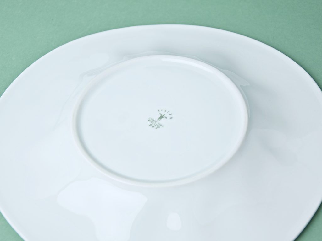 Beautiful design porcelain plate (it has a nice big plate edge, but the dining area is roughly like a regular dessert plate). Atypical "crumpled" shape from the FLAMENCO collection. No decor - pure white. Made in the Czech Republic by the G. Benedikt 1882 porcelain manufactory, under one of their original brands - Lilien Austria.