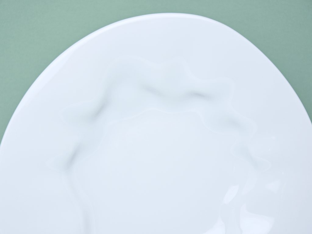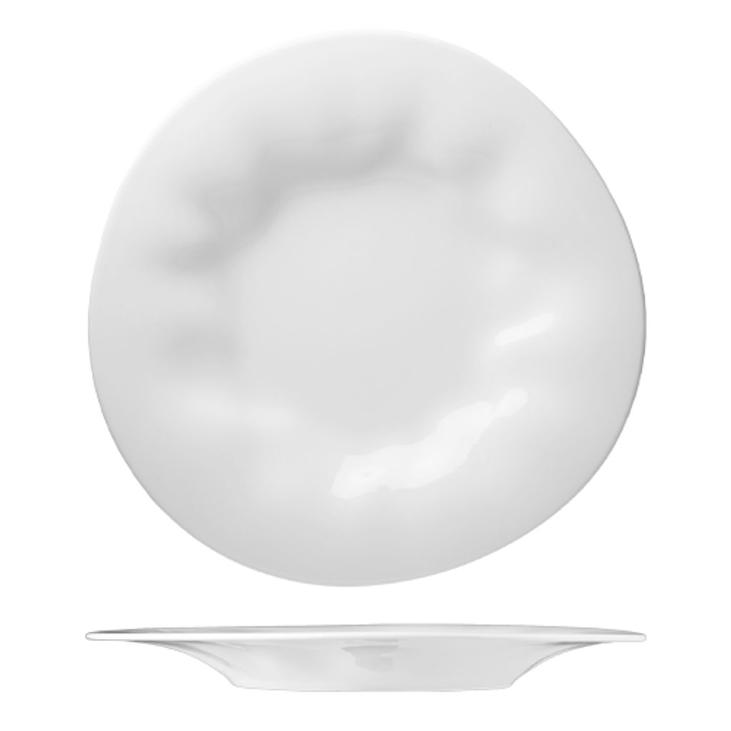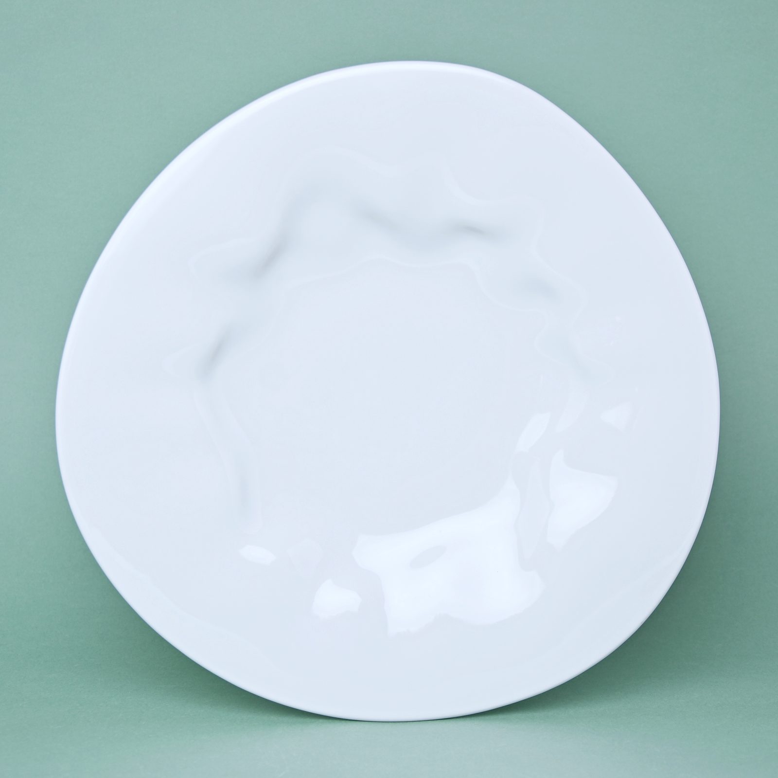 Beautiful design porcelain plate (it has a nice big plate edge, but the dining area is roughly like a regular dinner plate). Atypical "crumpled" shape from the FLAMENCO collection. No decor - pure white. Made in the Czech Republic by the G. Benedikt 1882 porcelain manufactory, under one of their original brands - Lilien Austria.