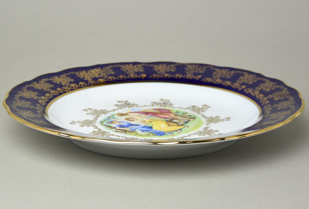 Dish round flat 31 cm (club plate), The Three Graces + gold + COBALT, Queen's crown porcelain