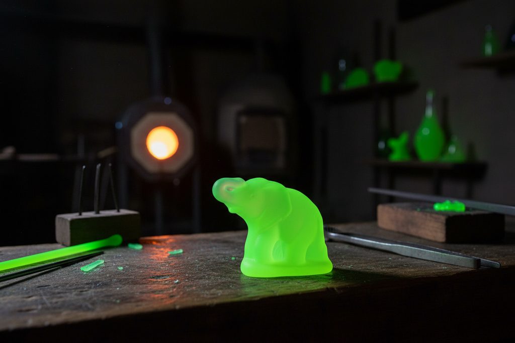 Decorative Glass Elephant, Made of Genuine Uranium Glass, Handcrafted at the Janov Glassworks