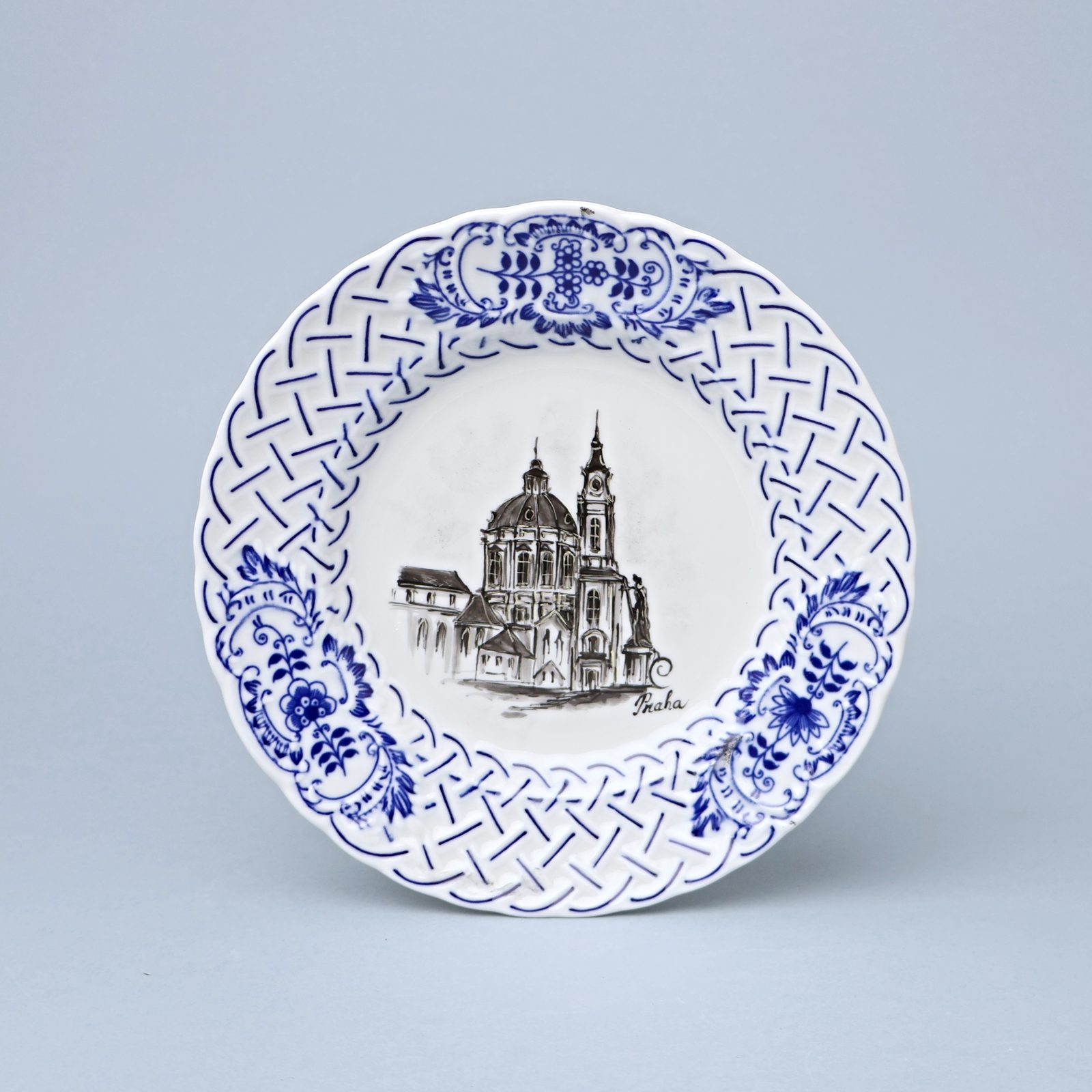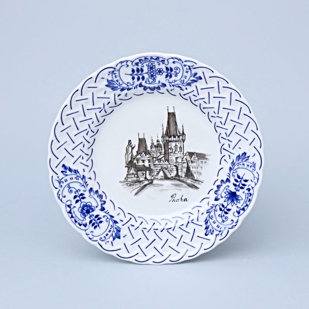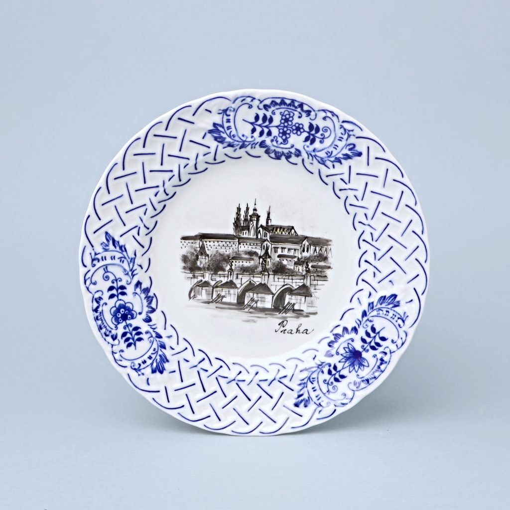 A completely original porcelain dessert relief plate featuring motifs of famous Prague landmarks, hand-decorated by Vilém Janoušek (JV Porcelán). The plate is also decorated with the traditional “cibulák” (onion pattern) design. It is also suitable for hanging on a wall.