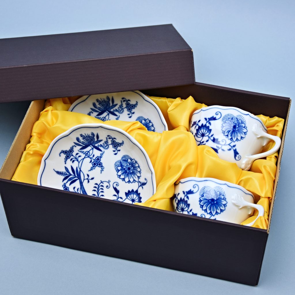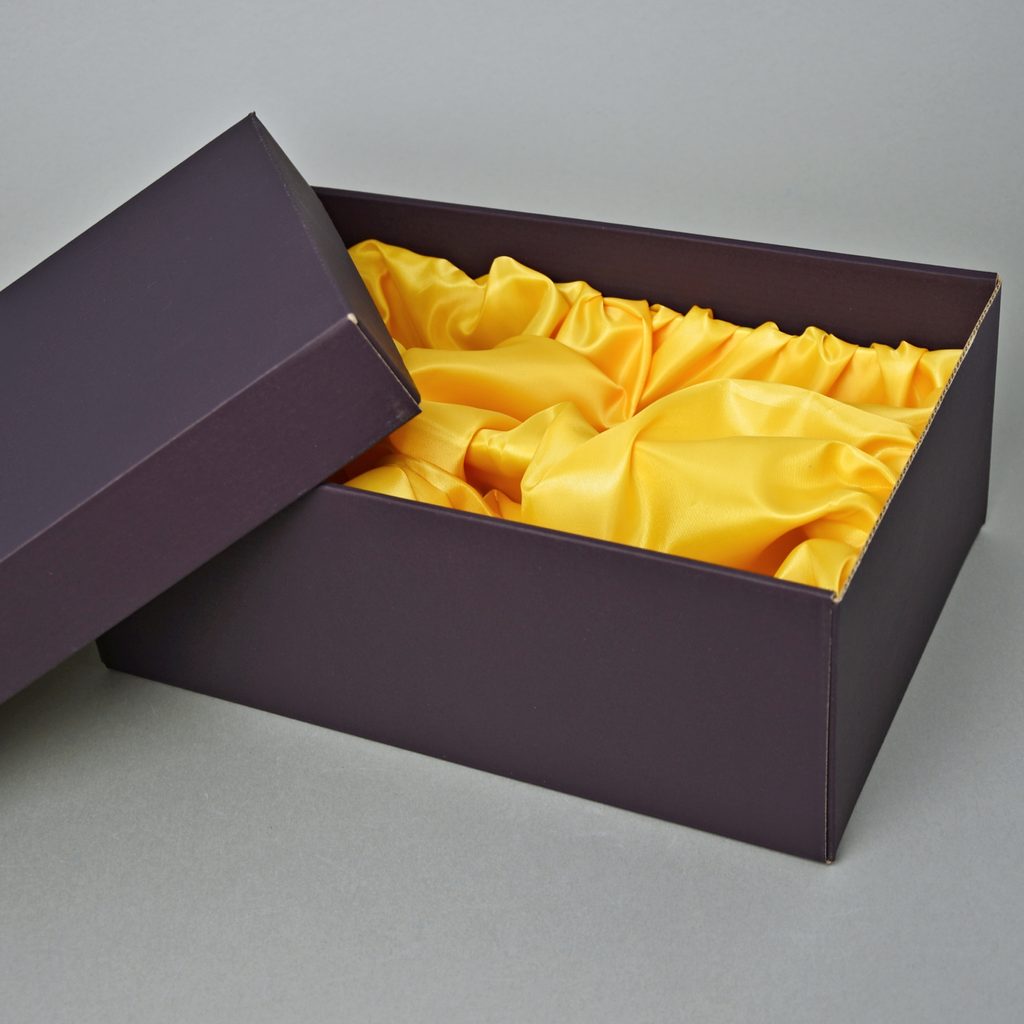Dark brown-purple gift box lined with yellow satin. Ideal size for 4 smaller mugs or 2 x cup and saucer.