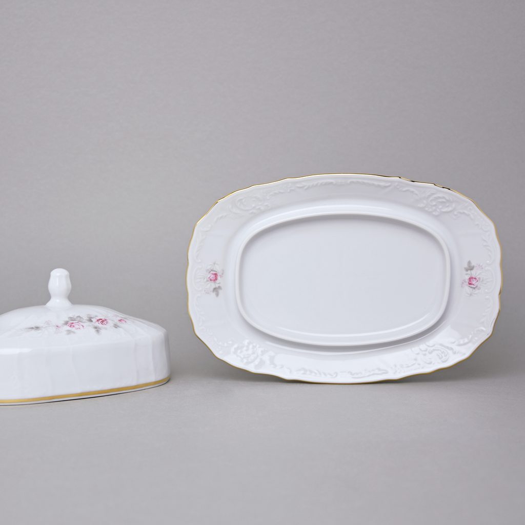 Gold line: Butter dish 250 g, Thun 1794 Carlsbad porcelain, BERNADOTTE roses