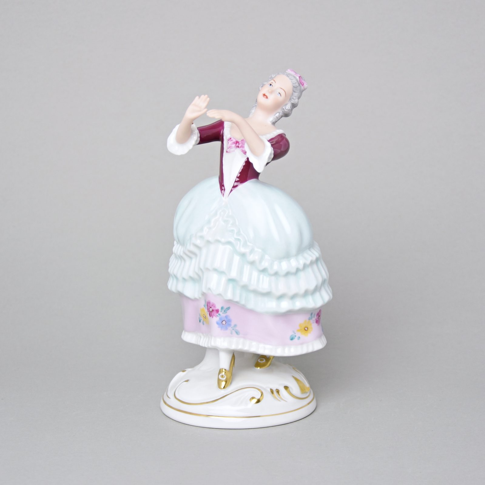Porcelain figure of an elegant lady dancing. Made in Duchcov (Royal Dux Bohemia). Details are decorated with gold.
