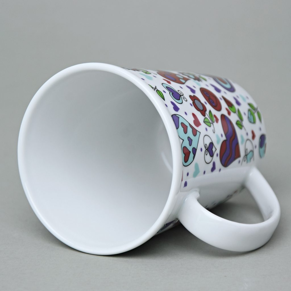 The popular large Erin mug with a volume of 420 ml with a playful decor of hearts and flowers in the colors: red - purple - turquoise. Made in the traditional Czech porcelain factory Český porcelán a.s.