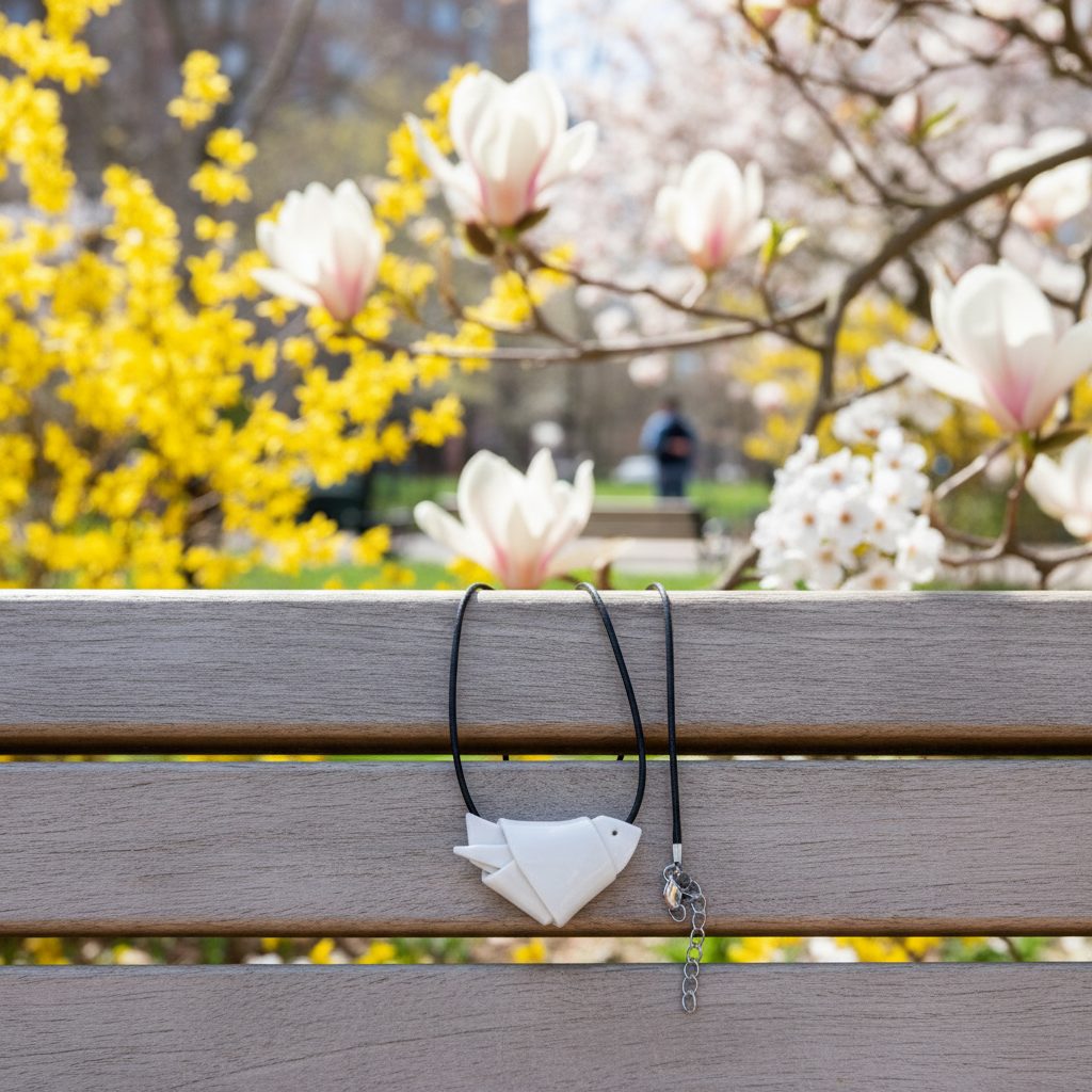 The shiny white surface of the jewel is complemented by a fine black cable on which it is suspended. Each of our jewelry is a unique original, so each bird may have a slightly different shape.