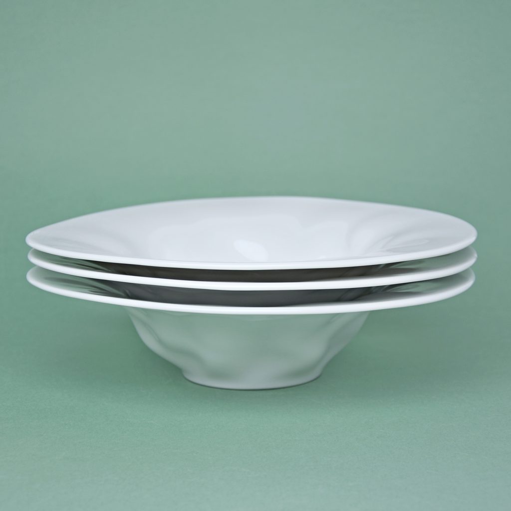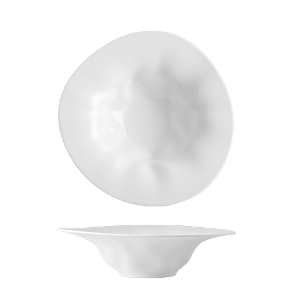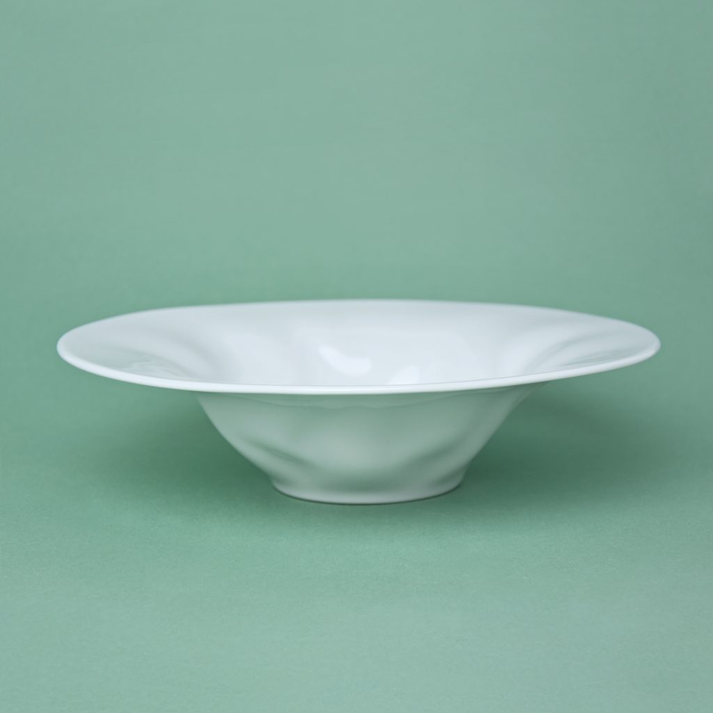 Beautiful design porcelain pasta / soup plate. Atypical "crumpled" shape from the FLAMENCO collection. No decor - pure white. Made in the Czech Republic by the G. Benedikt 1882 porcelain manufactory, under one of their original brands - Lilien Austria.