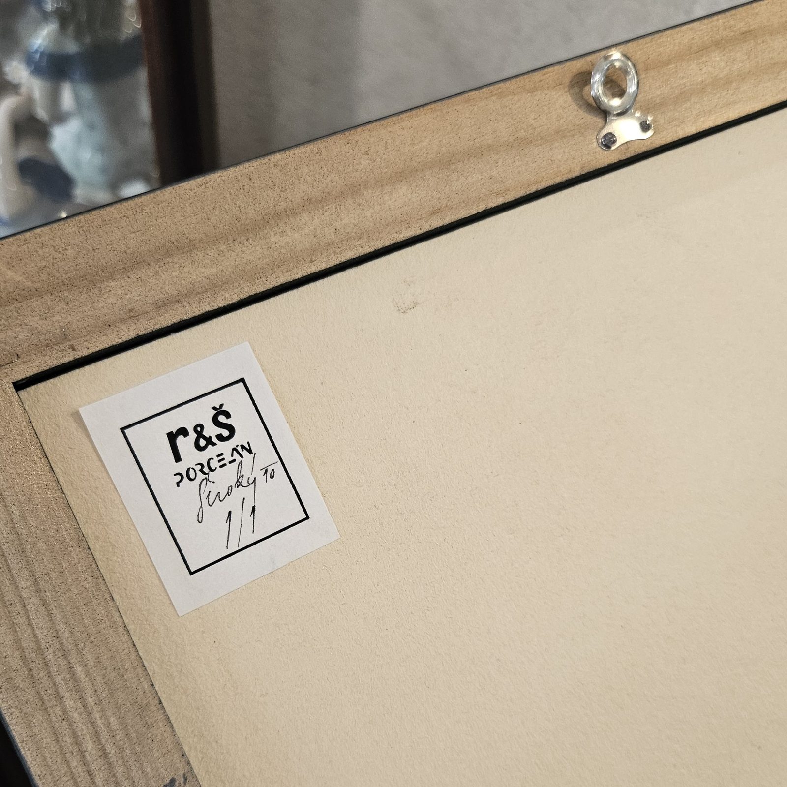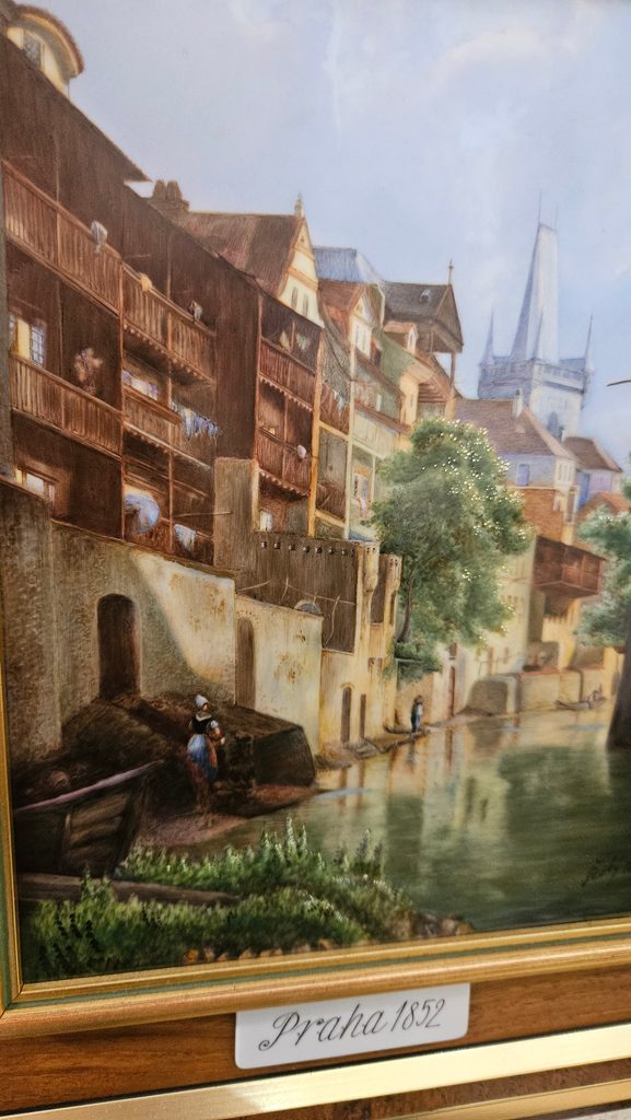 A Prague view 1852 by famous Czech painter on porcelain Mr Roman Široký, wooden frame + paintings on porcelain tale