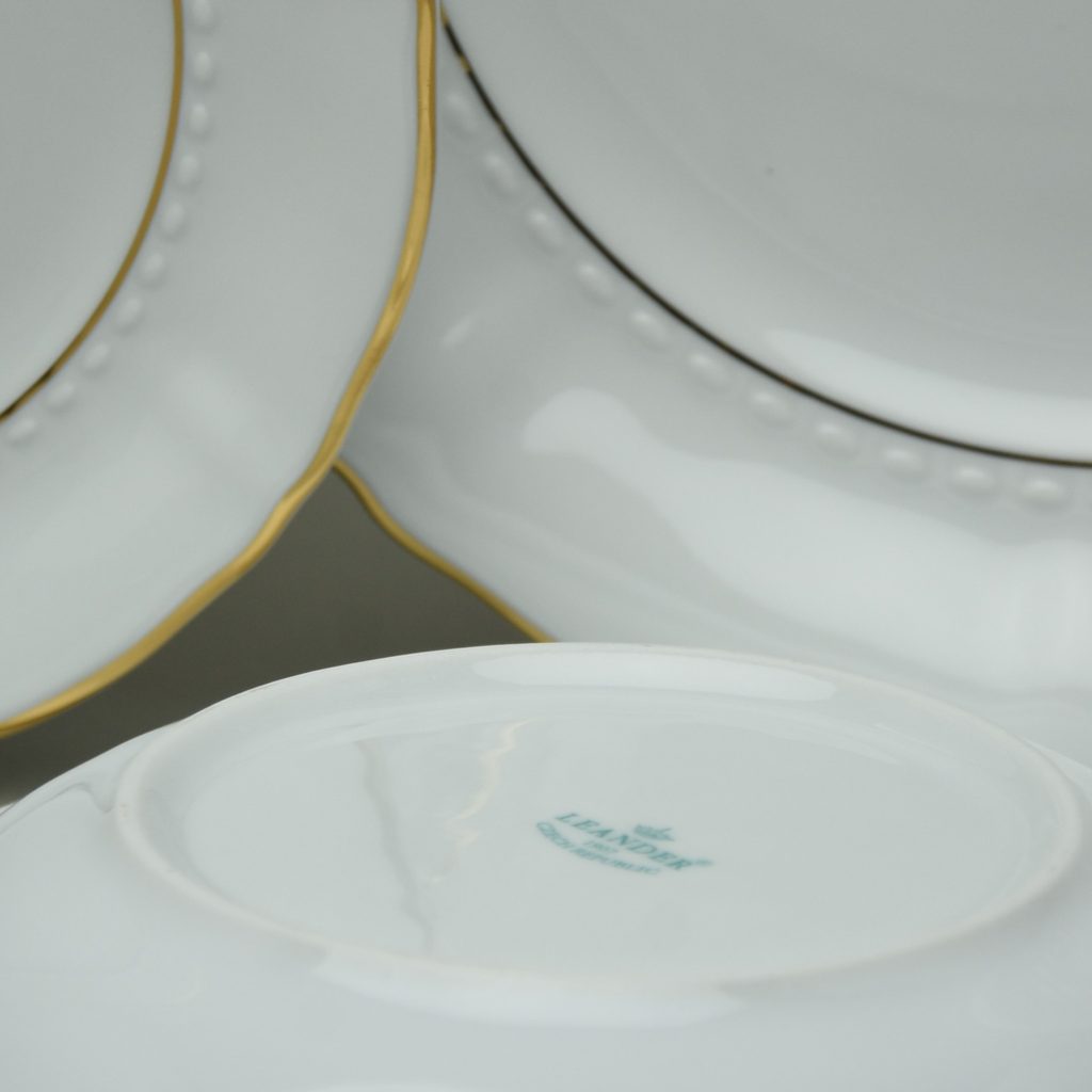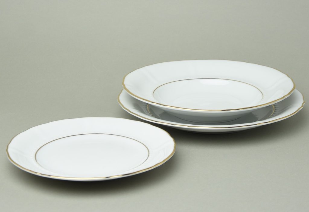 Plate set for 6 persons, Sonata form (evegreen of the Leander manufacturer), decoration by 2 gold lines, Leander 1907: 6 plate dinnert 25 cm, 6 plate deep 23 cm, 6 plate dessert 19 cm