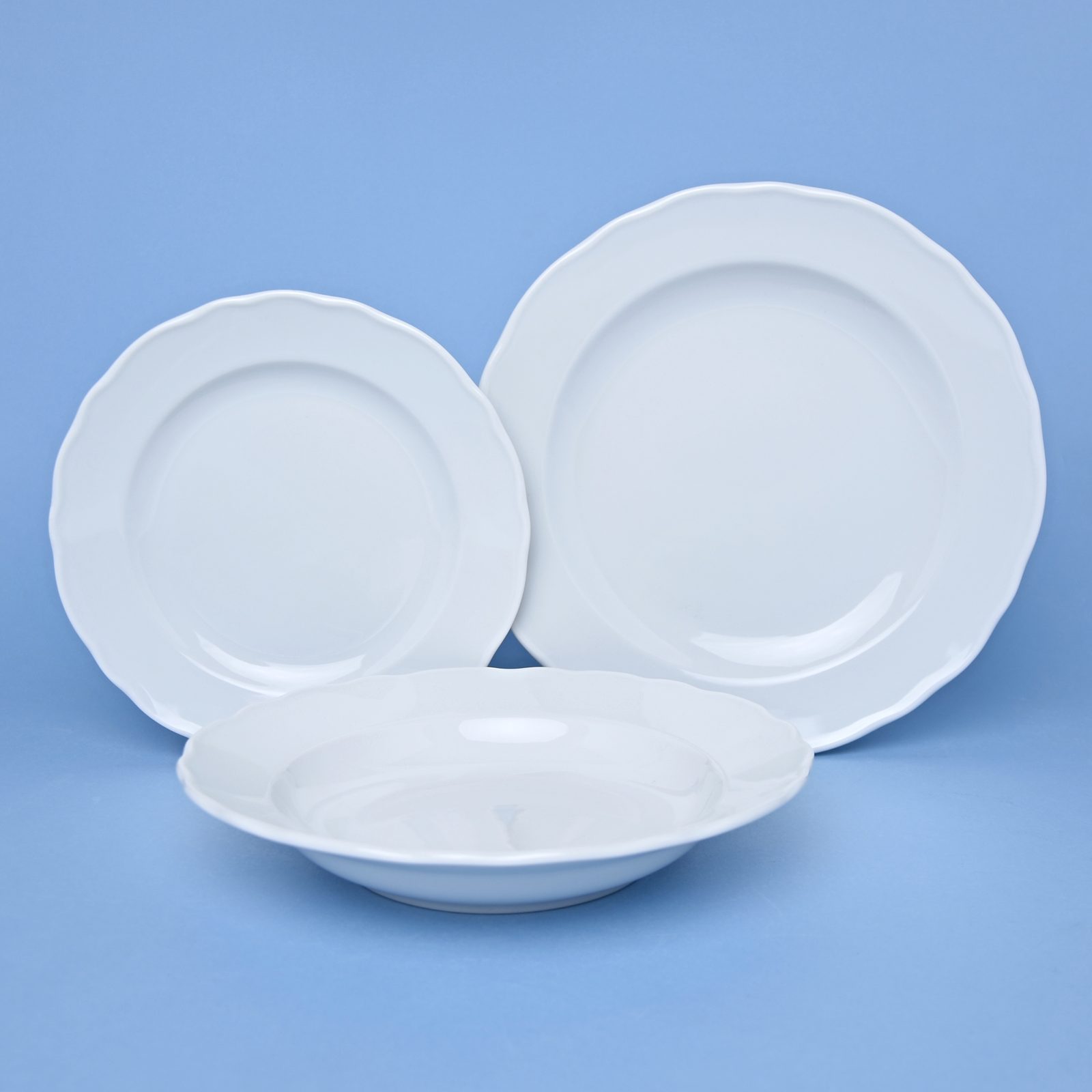 Plate set for 6 persons, 24, 21, 19 cm, White, Cesky porcelan a.s. Solid white porcelain for everyday use of Cesky porcelan a.s. manufcturer. A base for popular Blue Onion pattern. 6x plate flat 24 cm, 6x plate deep 21 cm, 6x plate dessert 19 cm