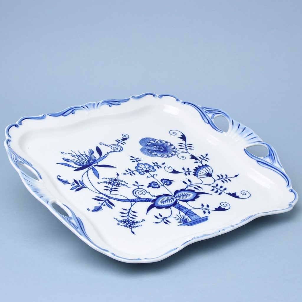 square (usable area is a square - with handles it is a rectangle) Aida tray with handles - Blue onion decor - beautiful porcelain tray with a good grip for all kinds of delicacies or serving tea / coffee services