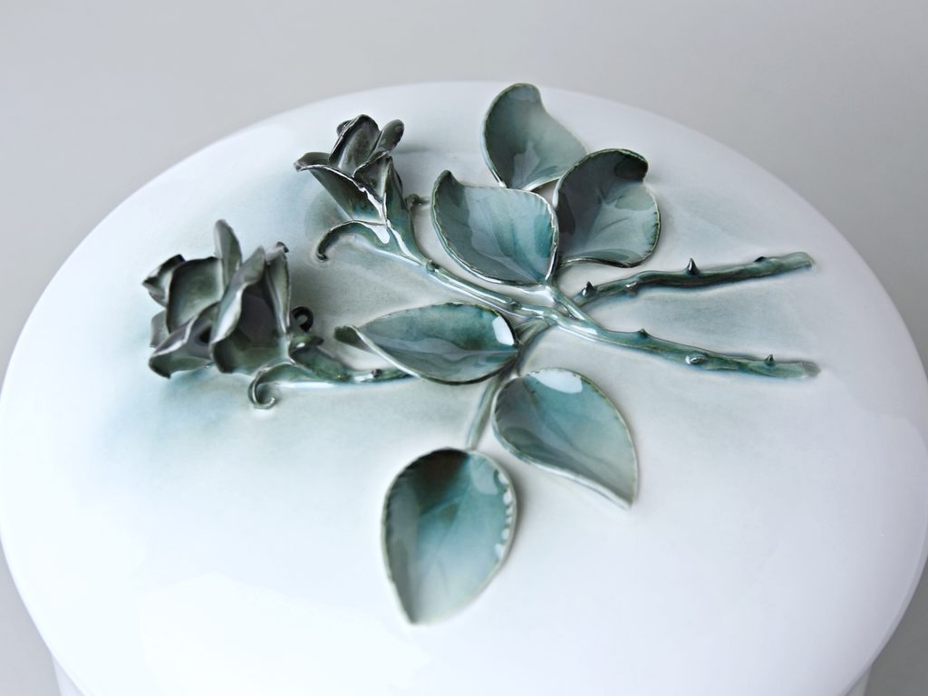 Porcelain urn case / jar with two roses in a petrol green color on the top of the lid. Height 29 cm, diameter 19.5 cm. Made in the Czech manufactory Duchcov (Royal Dux Bohemia).