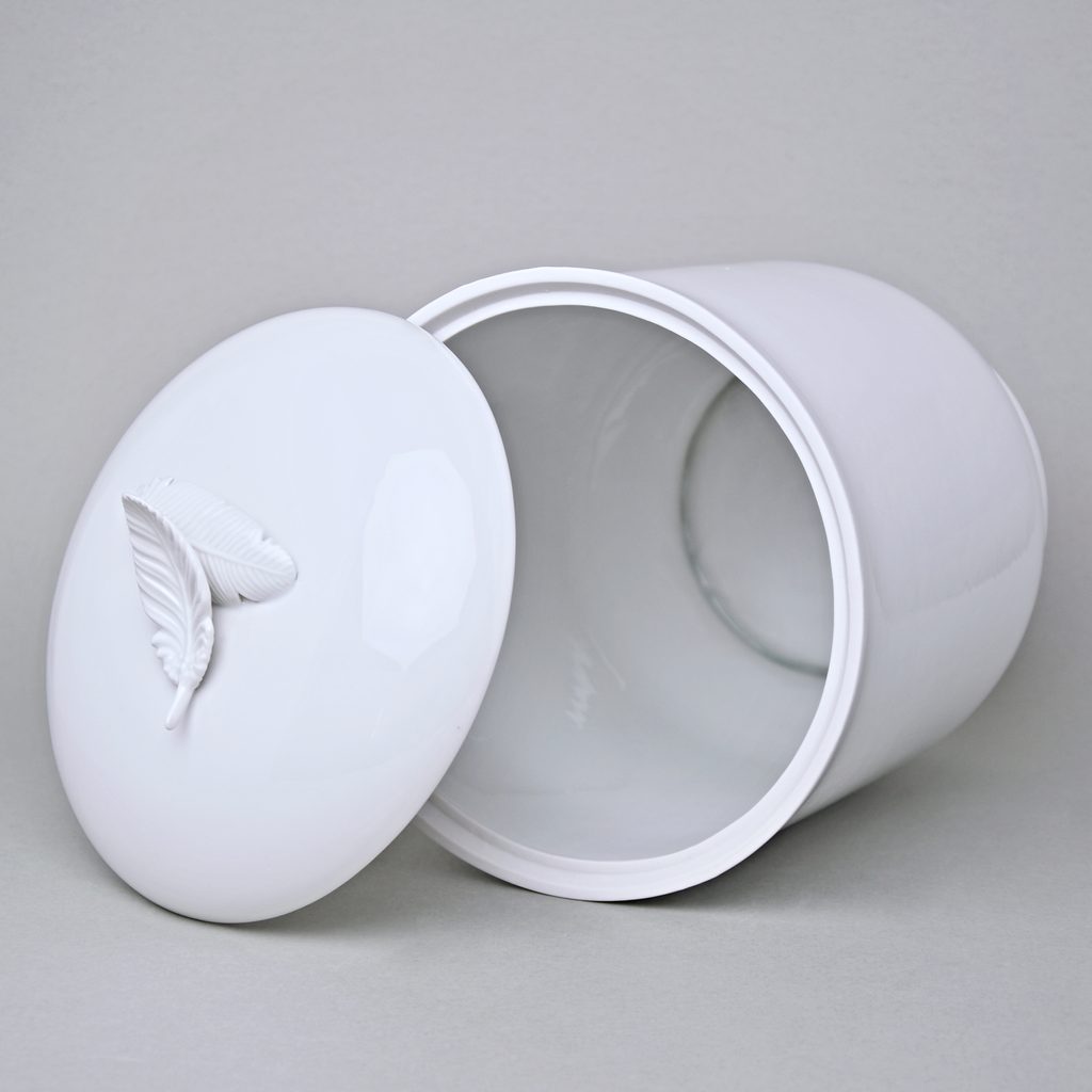 Porcelain urn case / jar with a feather on the lid. Height 29,5 cm, diameter 19.5 cm. Made in the Czech manufactory Duchcov (Royal Dux Bohemia).
