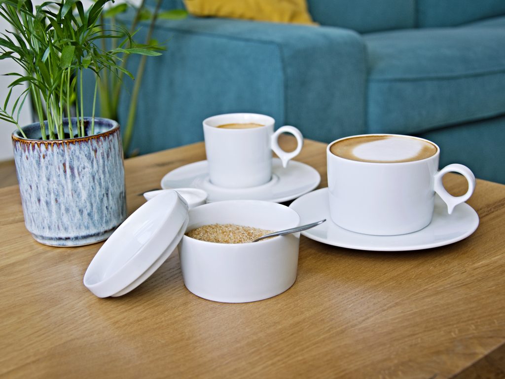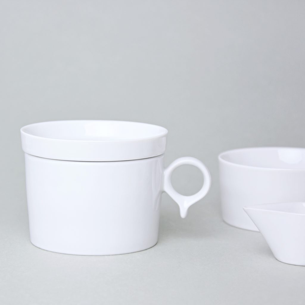 This collection is not only beautiful, the author thought of functionality and practical use at the same time. The saucers for tea, coffee and espresso cups are the same size, so all cups fit to one type of saucer. The cutout is formed by a raised groove. Larger cups hug the groove with the bottom from the outside and small espresso cups fit beautifully anchored in the middle of the cut-out. The lid from the sugar bowl also fits as a lid for a coffee or tea cup, so it has various possibilities of use.
