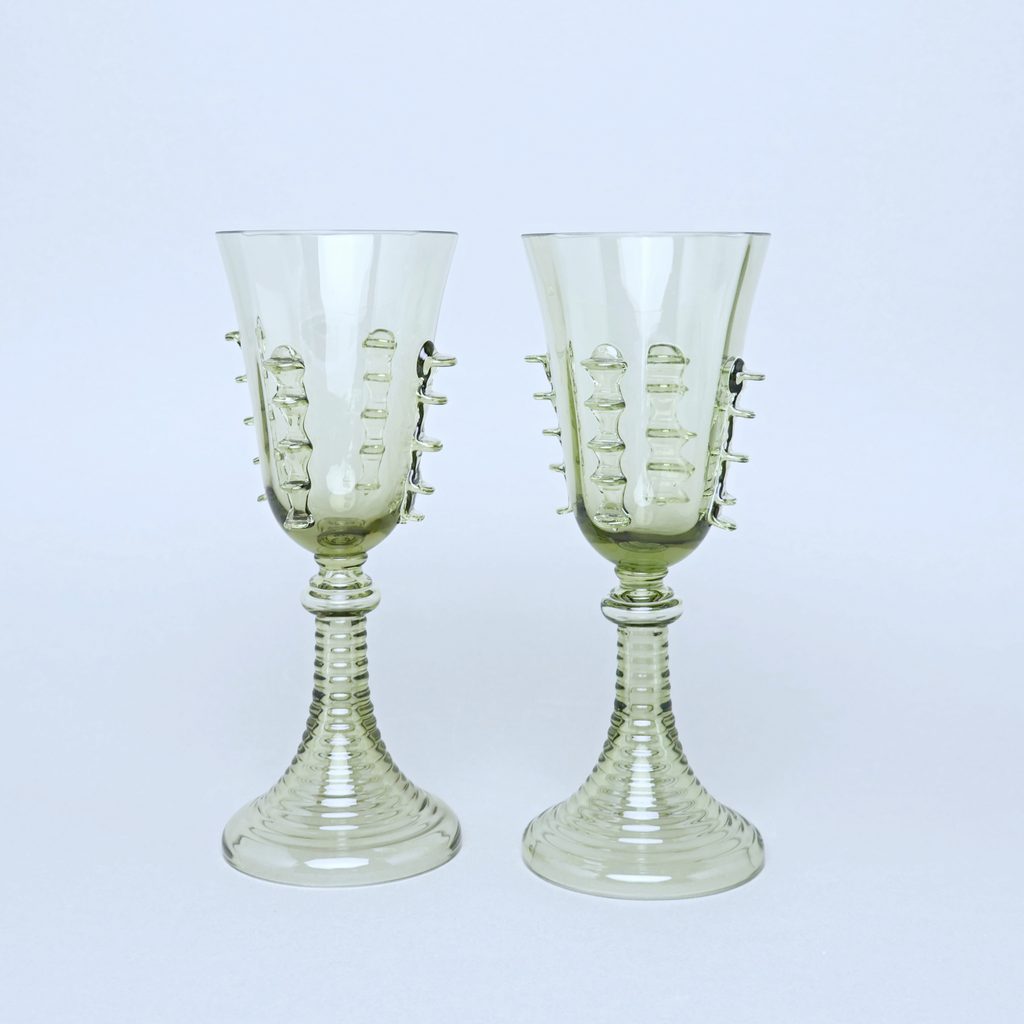 Set of vintage Roemer (Roman) glass wine glasses, in a beautiful forest green. The soda-potassium glass has a great shine and a beautiful sound.