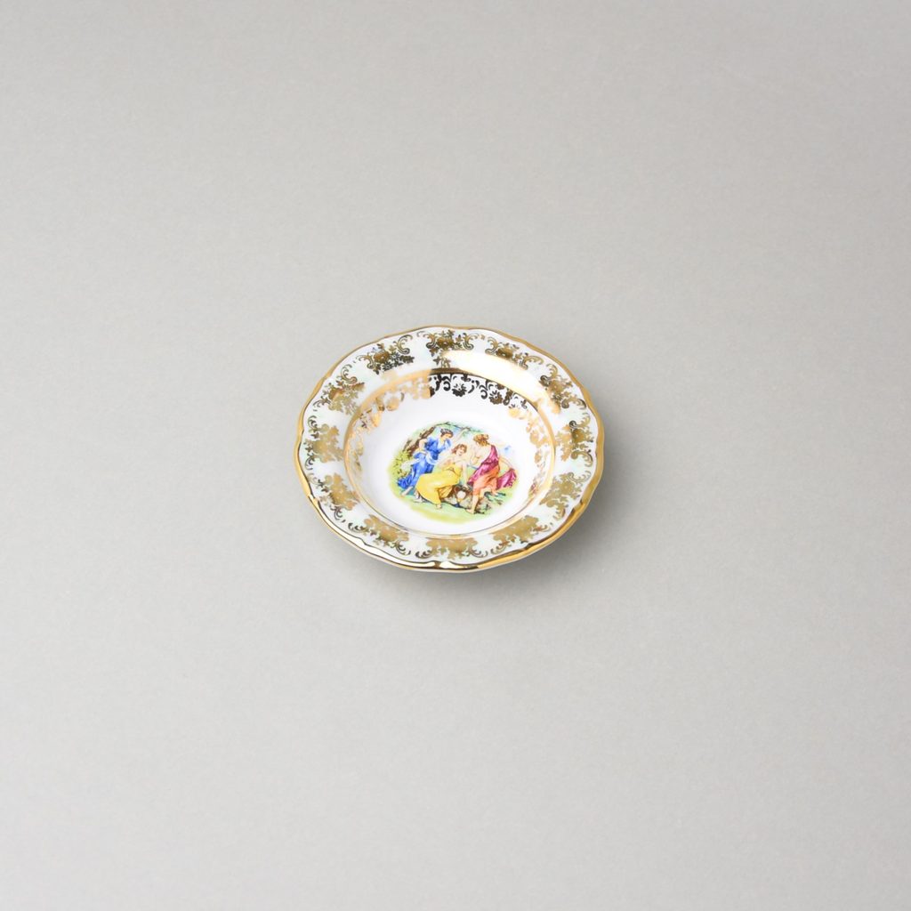 a small side dish bowl (also for jam, honey) called a Rosette, richly decorated with the 3 graces and gold, 10.5 x 2.7 cm, original shape of the QueensCrown manufactory near K. Vary