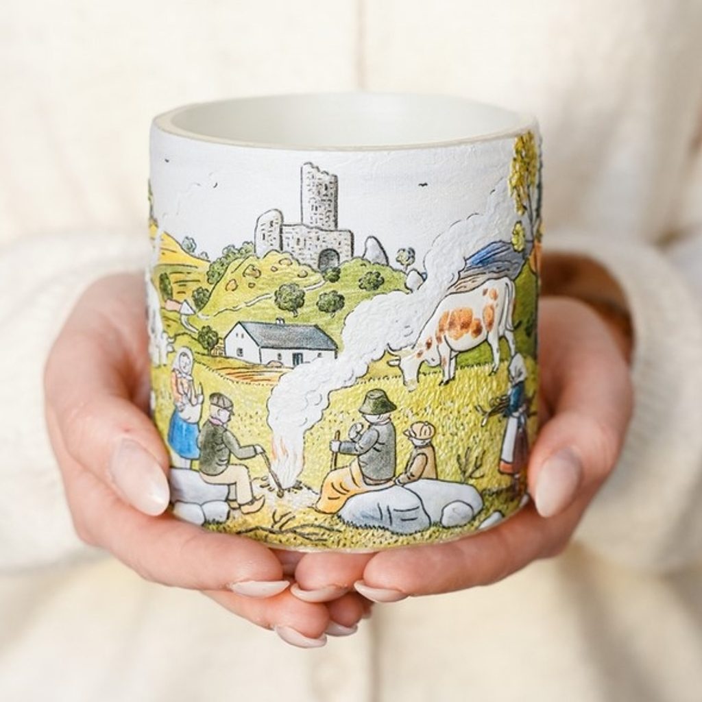 The lantern's decor features an autumn time motif in Lada region. Cow herders are roasting potatoes in oh in the field and typical Ladov houses and ruins are in the background.