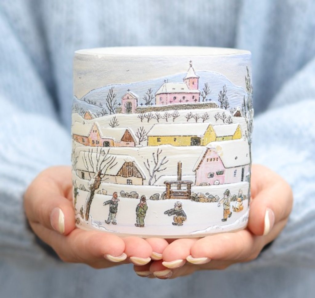 The decor of the lantern / transparent candle holder features the motif of the winter village of Hrusice, where children are building a snowman. In the background on the lantern we can find the typical church of St. Wenceslas from Hrusice.
