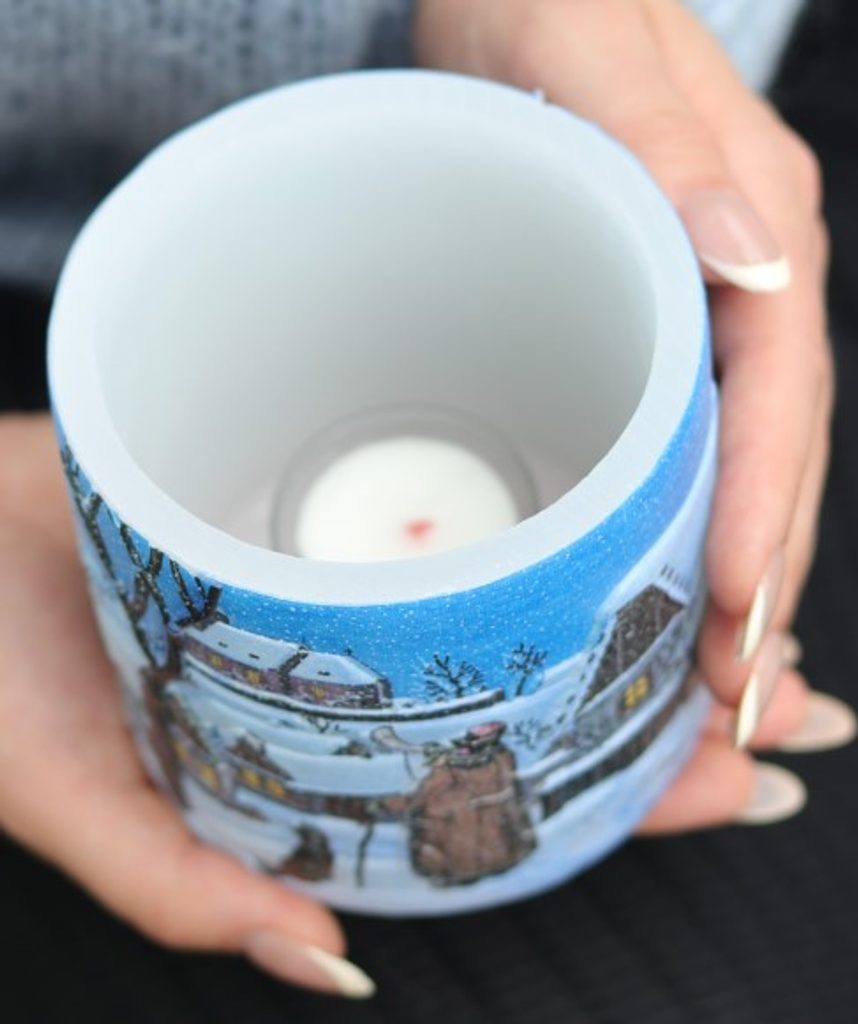 The decor of the lantern / transparent candle holder features the motif of the winter village of Hrusice, where children are building a snowman. In the background on the lantern we can find the typical church of St. Wenceslas from Hrusice.