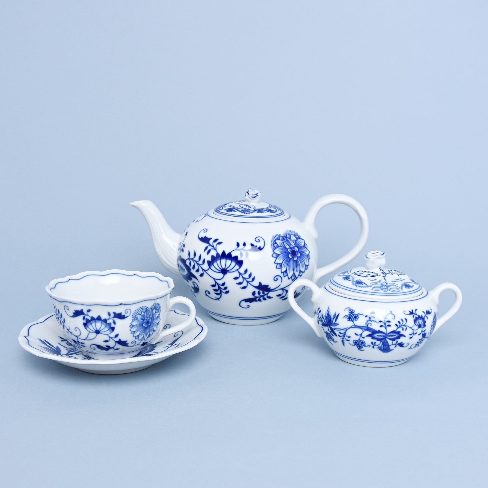 Tea set for 4 pers., Original Blue Onion Pattern Teapot 0,95 l plus 4 cups plus saucers 0,2 l plus sugar bowl with handles