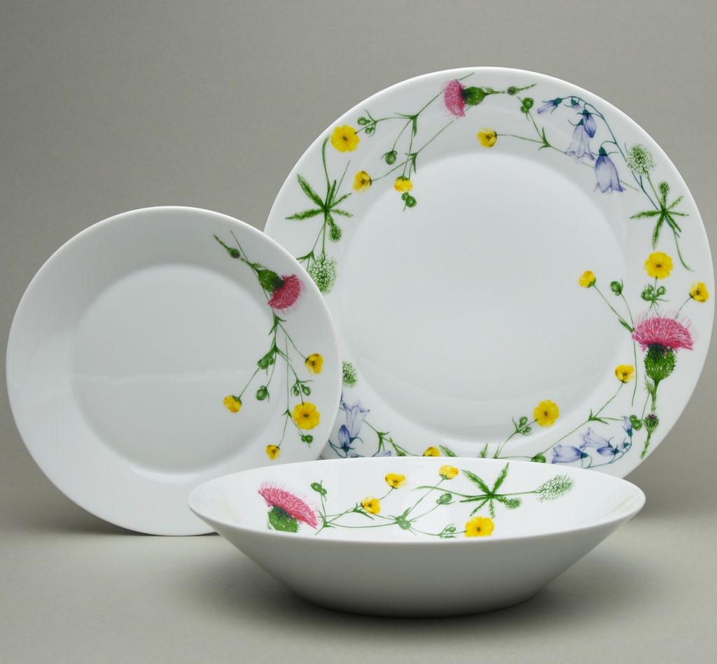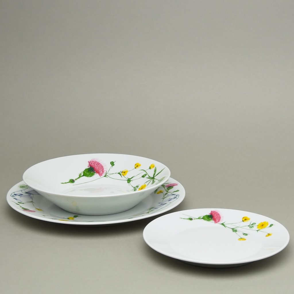 Plate set for 4 people in the shape of Tom - Thun banner with fresh underglaze decoration number 30443 (a total of four flowers, a thistle, a globe flower, a bell and a clover, variously combined)