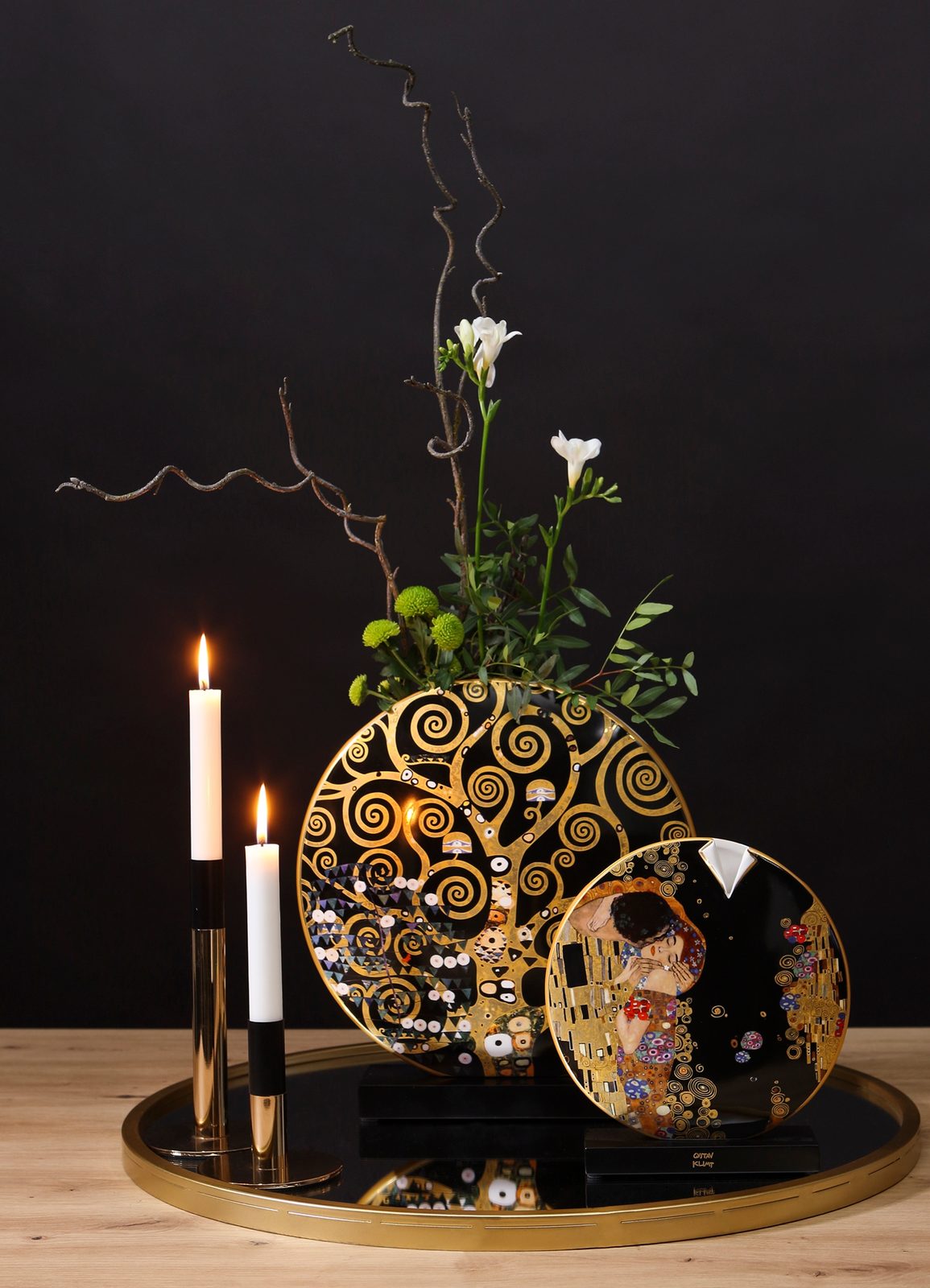 Designed like a levitating disk appears the vase mounted on a wooden base. The decorative object perfectly supports the reproduction of famous paintings by Gustav Klimt. With or without flower arrangement - it is an eyecatcher and inspiration of style. Available in two sizes.