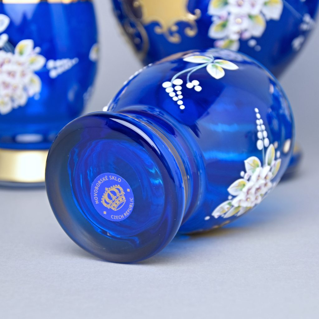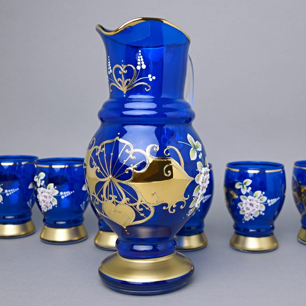 Beautiful interesting blue glass handmade set not only for wine, richly decorated with gold (paint) and enameled flowers. The raw material is produced and decorated by one of the many glass and crystal workshops in the Nový Bor city (ger. Haida), thze centre of Bohemian glass manufacturing