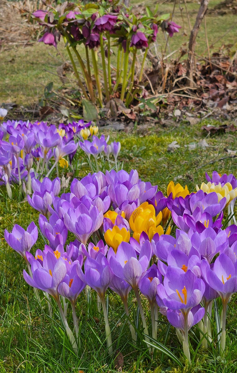 Blooming Crocuses and Helleborus in my garden, March 2023